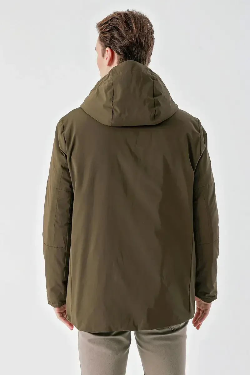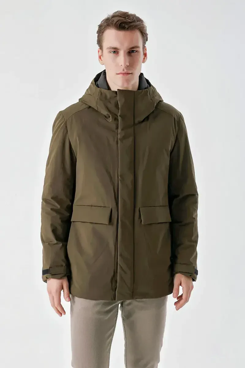 Men's coat, khaki coat, floral pattern coat, snap button coat, hooded coat, dynamic fit coat, relaxed fit coat, outdoor coat, waterproof coat, ModaZon coat
