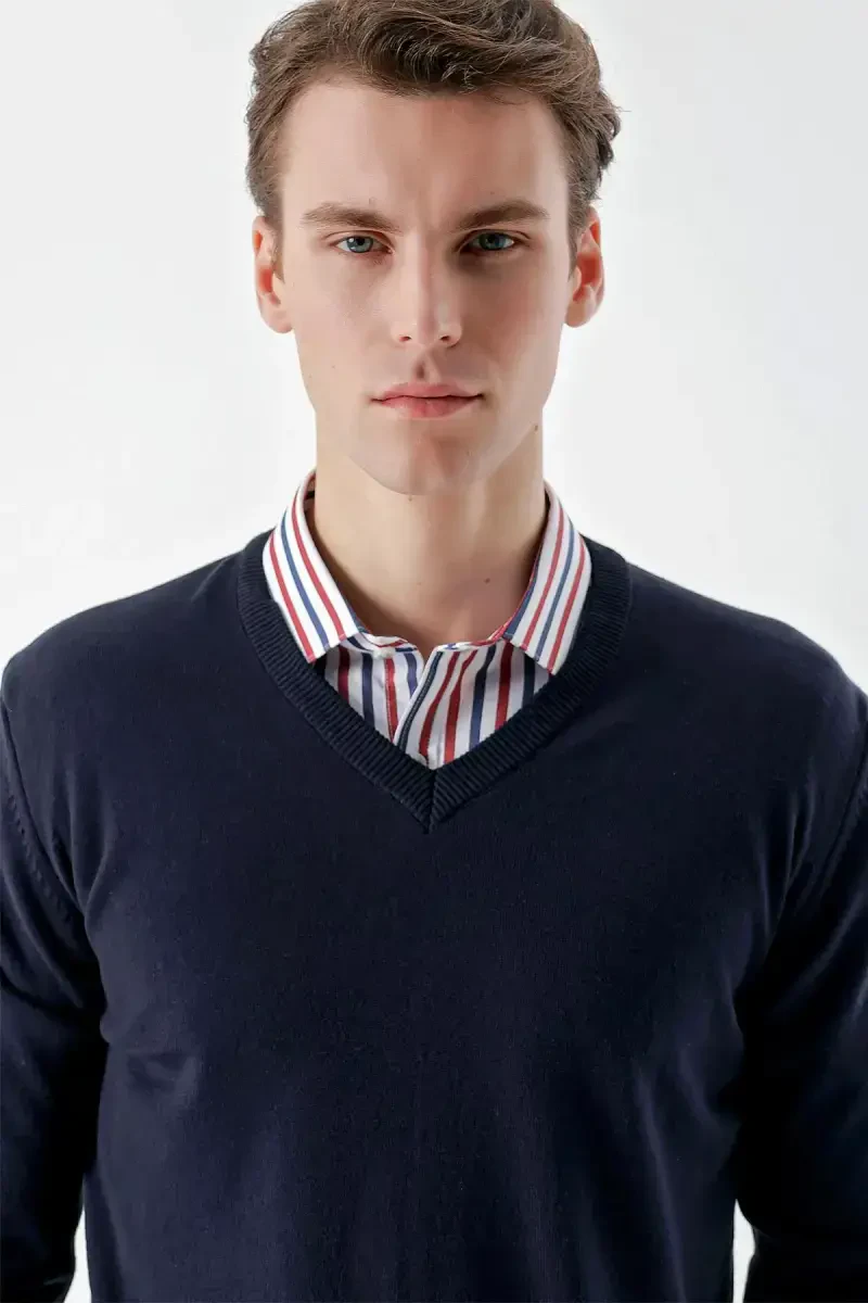 Men's knitwear, navy knitwear, V-neck knitwear, basic knitwear, relaxed fit knitwear, dynamic fit knitwear, modazone, men's clothing, knitwear models, stylish knitwear