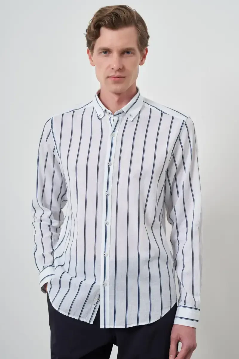 ModaZon Men's Navy Blue Linen Dynamic Fit Button-Down Collar Shirt is a must-have piece in the wardrobes of stylish men. This shirt combines modern design and superior comfort, offering a suitable option for both daily use and special occasions. The timeless elegance of navy blue, the natural texture of linen fabric, and the comfort of the dynamic fit cut combine to create a unique experience. The linen fabric of the shirt prevents sweating in hot weather, keeping you cool all day long. Since linen is made from natural fibers, it is skin-friendly and less likely to cause allergic reactions. The dynamic fit cut gently follows the lines of your body without restricting your freedom of movement. This way, you look stylish and feel comfortable all day long. The button-down collar detail adds a classic touch to the shirt while allowing you to make different combinations. Whether you create a sporty style with jeans or achieve a more elegant look with chino pants, this shirt easily adapts to any style. ModaZon Men's Navy Blue Linen Dynamic Fit Button-Down Collar Shirt not only looks stylish but also offers long-lasting use. Thanks to its high-quality material and careful workmanship, it remains as new as the first day for many years. The navy blue color of the shirt also stands out with its easy combinability. It is a perfect match with neutral colors such as white, beige, and gray, while you can make bold combinations with vibrant colors such as burgundy and mustard yellow. Whether you use the shirt alone or complete it with a jacket or blazer, it helps you reflect your style in any case. ModaZon is known as a brand that combines quality and elegance in men's clothing. This shirt is a product that reflects this philosophy of the brand. If you want to renew your wardrobe and bring a new breath to your style, ModaZon Men's Navy Blue Linen Dynamic Fit Button-Down Collar Shirt is for you. Offering both comfort and elegance together, this shirt will appeal to every man.