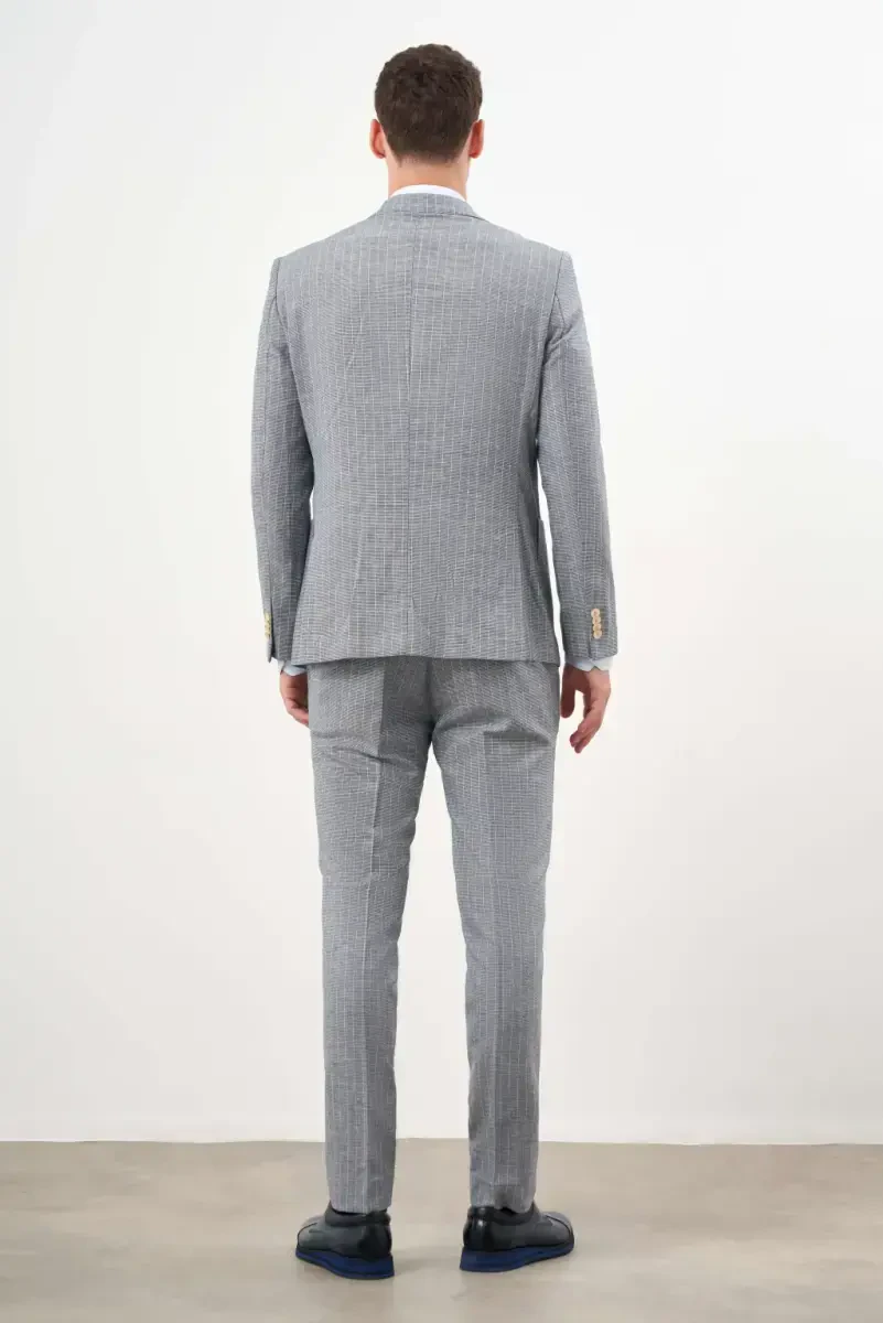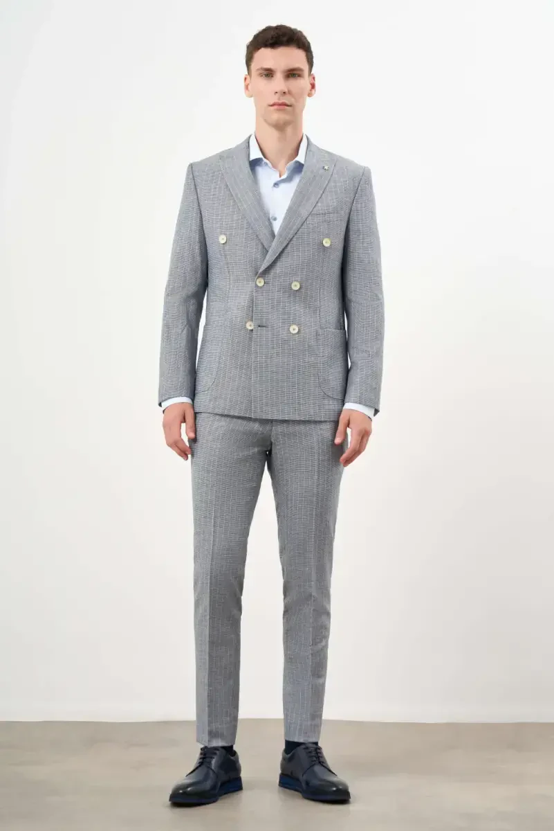 Men's suit, navy linen, double-breasted suit, slim fit, peak lapel, trendy suit, fashion, elegance, business meeting, special occasion