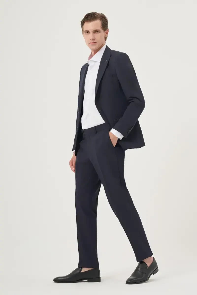 Suit, men's, navy blue, slim fit, polyviscose, peak lapel, modern, stylish, comfortable, ModaZon