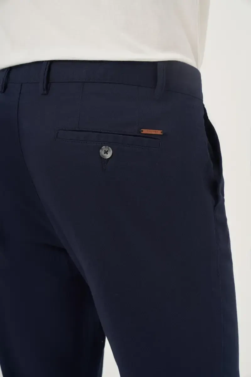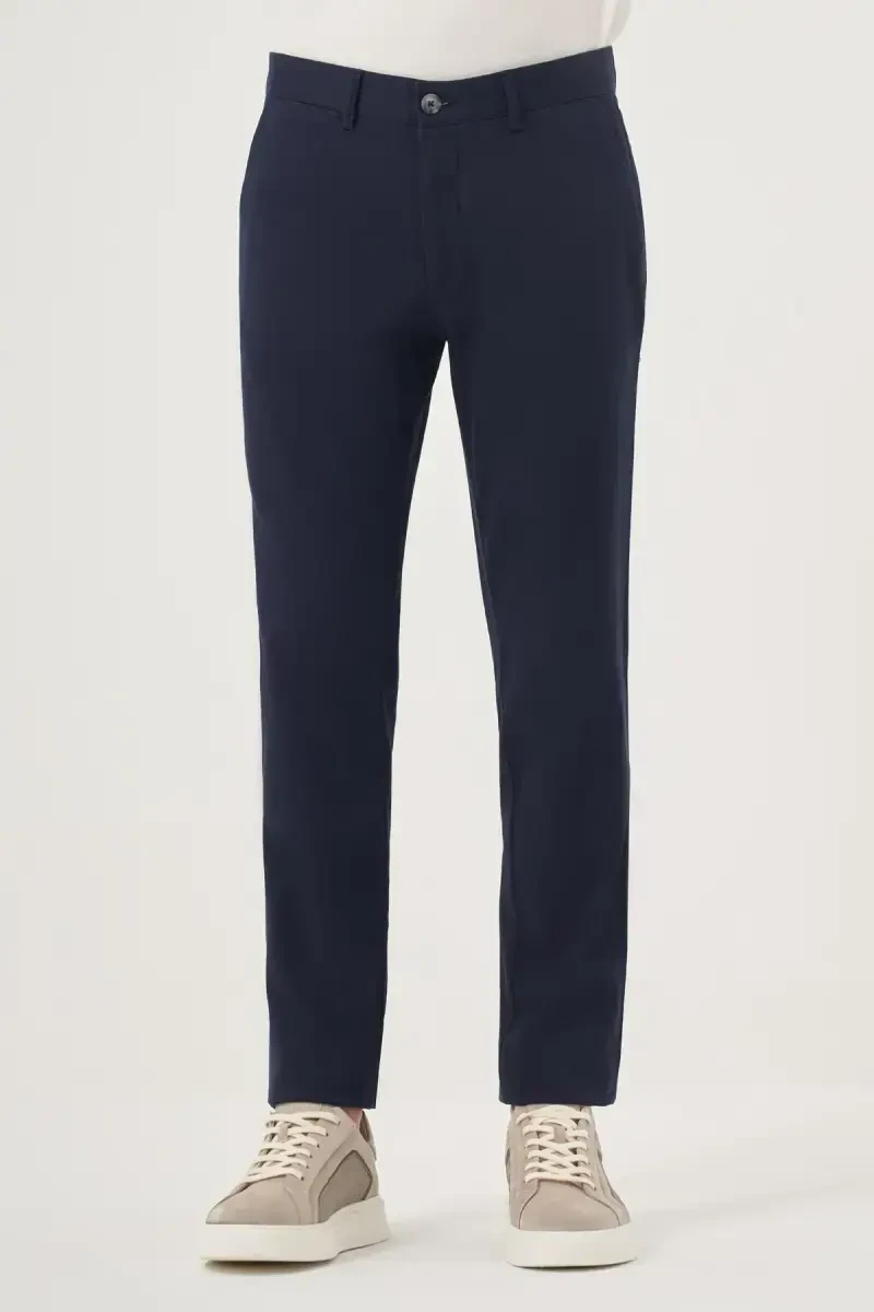 Modazone Men's Navy Blue Summer Cotton Side Pocket Slim Fit Chino Pants are a special design that offers both comfort and elegance together on hot summer days. The most distinctive feature of the trousers is that they are made of 100% cotton fabric. In this way, it offers a skin-friendly touch, minimizes sweating and provides a fresh feeling throughout the day. Cotton fabric, which is especially preferred in hot weather, helps the skin breathe thanks to its breathability and thus offers comfortable use throughout the day. The slim fit cut is designed in a structure that fits the body but does not restrict freedom of movement. This cut is ideal for men who want to achieve a modern and fit look. While emphasizing body lines, it also offers comfortable use. The slim fit cut allows you to create a stylish and modern style, especially when combined with t-shirts, shirts or polo necks. The pockets on the sides of the trousers offer both a functional feature and add a different atmosphere to the design. Side pockets allow you to easily carry items such as phones, wallets or keys in daily use. At the same time, it adds a sporty and modern touch to the overall design of the trousers. The placement and size of the pockets are carefully designed to offer usability without disturbing the overall aesthetics of the trousers. Navy blue is a classic and timeless option in men's clothing. This color can be easily combined with different colors and can adapt to any environment. Whether you make a casual combination with a white t-shirt or achieve a more formal look with a stylish shirt, navy blue chino pants will always suit your style. Navy blue is also a color that does not get dirty easily and maintains its clean appearance for a long time, which extends the life of the trousers. Modazone Men's Navy Blue Summer Cotton Side Pocket Slim Fit Chino Pants are not only stylish and comfortable, but also durable and long-lasting. Thanks to its high-quality stitching and durable fabric, it is suitable for long-term use. The trousers are also very easy to care for; It is machine washable and ironable. These features make the trousers a practical option for daily use. As a result, Modazone Men's Navy Blue Summer Cotton Side Pocket Slim Fit Chino Pants are an excellent choice for men who do not want to compromise on their style and comfort in hot weather. With its cotton fabric, slim fit cut, side pocket details and navy blue color, it will be an indispensable part of your wardrobe. These chino trousers, which you can choose for daily use or for more special moments, will appeal to stylish men.