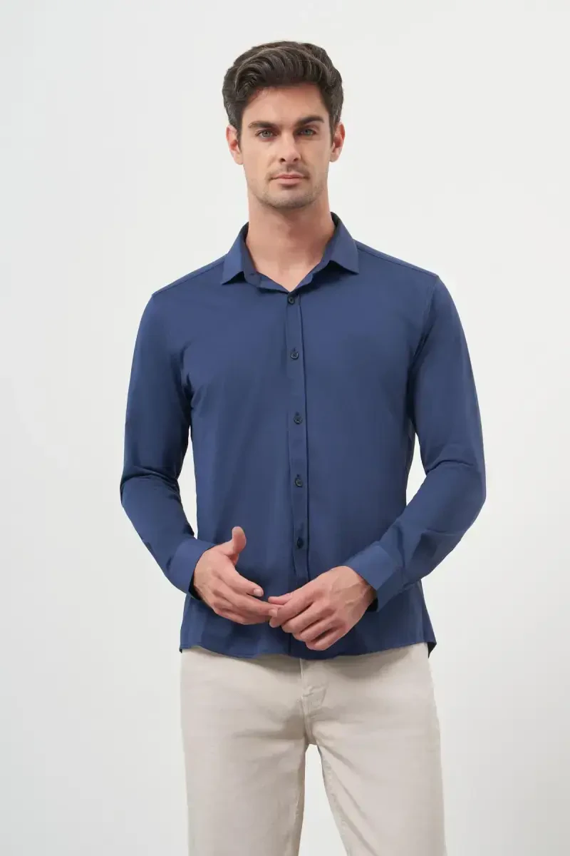 Experience elegance and comfort together with the Modazone Men's Navy Blue Trend Slim Fit Italian Collar Shirt. This specially designed shirt is a must-have piece in the modern man's wardrobe. Made from a blend of 65% cotton and 35% polyester, this shirt offers comfortable wear all day long while also standing out with its durability. Thanks to its slim fit cut, it creates a stylish silhouette that fits the body perfectly. The Italian collar detail adds a sophisticated touch to the shirt, making it an ideal choice for both classic and modern combinations. The long-sleeved design increases its wearability in all seasons, while the patterned texture gives the shirt a unique look. The button-up front closure provides ease of use and complements the shirt's elegance. The navy blue color can be easily combined with any outfit and adds an elegant touch to your style. Whether for daily use or special occasions, you can always look stylish and well-groomed with the Modazone Men's Navy Blue Trend Slim Fit Italian Collar Shirt. Offering long-lasting use thanks to its high-quality fabric and careful workmanship, this shirt will be an indispensable part of your wardrobe. This shirt, produced with Modazone quality, will appeal to stylish men. Order now and enjoy the pleasure of elegance!