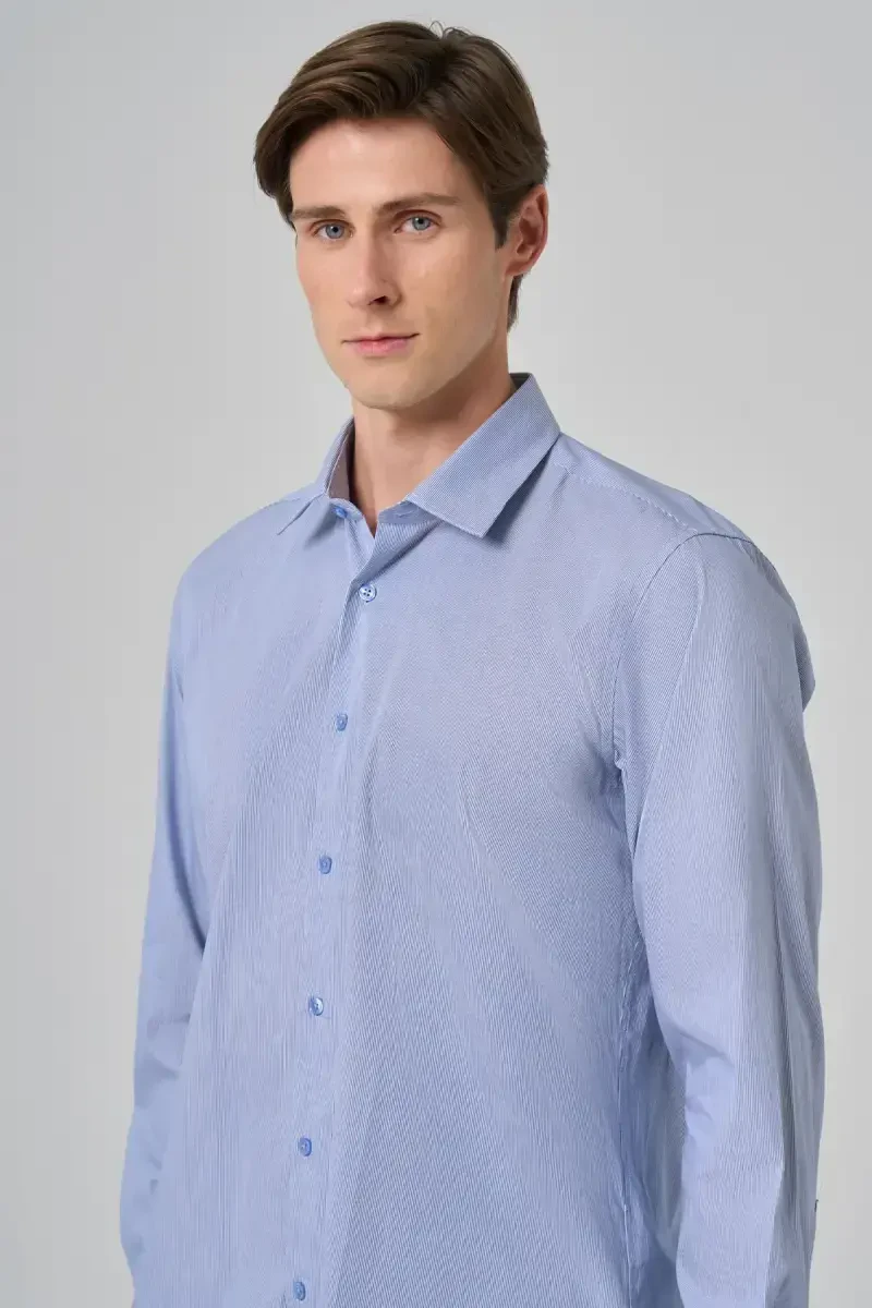 Chicness That Appeals to Your Fashion Taste: Meet the Modazone Men's Navy Blue Striped Regular Fit Stiff Collar Shirt!Product DescriptionTake your style to the next level with the Modazone Men's Navy Blue Striped Regular Fit Stiff Collar Shirt, a candidate to be the indispensable part of your wardrobe. Designed with the needs of the modern man in mind, this shirt will reflect your elegance and confidence in every setting, from business life to special events, from daily use to weekend getaways. Combining the nobility of navy blue with elegant stripes, this shirt cares not only about your appearance but also about your comfort. Thanks to its regular fit cut, it fits your body perfectly and does not restrict your freedom of movement. The stiff collar of the shirt always offers a neat and stylish look and is also suitable for tie use. Thanks to its high-quality fabric, it offers long-lasting use and is easy to iron. Its non-sweating structure allows you to stay fresh all day long. Whether you use it alone or combine it with a jacket or blazer, it is a piece that will complement your style in any case. The Modazone Men's Navy Blue Striped Regular Fit Stiff Collar Shirt is not just a shirt, but also a style statement. Bringing together classic and modern lines, this shirt will appeal to men of all ages. Make your style speak with this shirt, which is one of the most special gifts you can buy for yourself or your loved ones. Offering elegance and comfort together, this shirt is a candidate to be the most valuable piece of your wardrobe. Remember, dressing well is not just a choice, but also a sign of your respect for yourself. Redefine your style with Modazone!Product Features* Color: Navy Blue* Pattern: Striped* Fit: Regular Fit* Collar Type: Stiff Collar* Fabric: High Quality, Non-Sweating Fabric* Usage Area: Business, Special Occasion, Daily Use* Ironing: Easy to Iron* Combination Suggestion: Compatible with Jacket, Blazer, TieAdditional InformationIt is important to follow the washing instructions for the product to be long-lasting. It is recommended to wash the shirt inside out and at low temperature. Avoid using bleach. Instead of drying it in a dryer, hanging it to dry will help preserve the shape of the shirt. The fabric content and other detailed care instructions of the product are stated on the label.