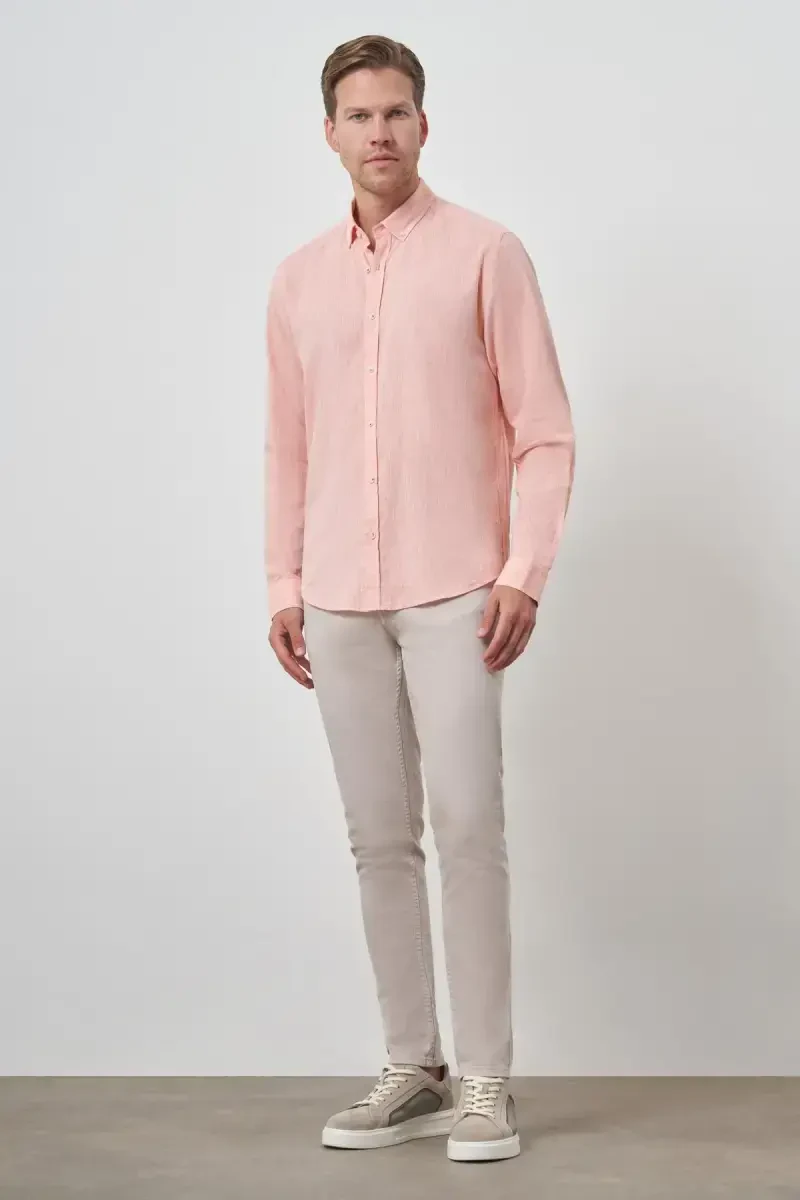 ModaZon Men's Orange Linen Trend Dynamic Fit Button-Down Collar Shirt is a stylish and comfortable option designed for stylish men. This shirt, which attracts attention with its linen fabric that keeps you cool in hot weather and its energetic orange color, is a candidate to be an indispensable part of your wardrobe. The dynamic fit cut offers a modern silhouette with its body-hugging but unrestricted structure. The button-down collar detail allows you to make different combinations, making the shirt wearable in both sporty and stylish environments. The natural wrinkling of linen adds a characteristic touch to the shirt while reducing the need for ironing. This feature offers practical use, especially when traveling. The orange color of the shirt adds vitality and energy to your style, while the lightness of the linen fabric provides comfort throughout the day. Whether you make a casual weekend combination with shorts or a more formal look with chino pants and a blazer, this shirt adapts to any environment. Produced with Modazon quality, this shirt will maintain its place in your wardrobe for many years with its long-lasting and durable structure. The carefully selected buttons of the shirt add elegance to the design, while the easy opening and closing feature provides ease of use. The breathable structure of linen fabric prevents sweating and allows the skin to breathe, helping you stay cool and dry even in hot weather. The dynamic fit cut fits different body types, ensuring that it looks stylish on every man. Modazon Men's Orange Linen Trend Dynamic Fit Button-Down Collar Shirt is an excellent choice for men who are looking for both style and comfort. This shirt allows you to reflect your style in any environment, from daily wear to special events. It is an ideal choice for men who like to dress stylishly and comfortably and is a must-have in your wardrobe. The product is made of high-quality materials and offers long-lasting use. This shirt, which offers style and comfort together, has a design that appeals to the style of every man. Let your style speak with the ModaZon Men's Orange Linen Trend Dynamic Fit Button-Down Collar Shirt. Always be striking and stylish with the natural texture of linen and the energy of orange. This shirt is not just clothing, but also a style statement.