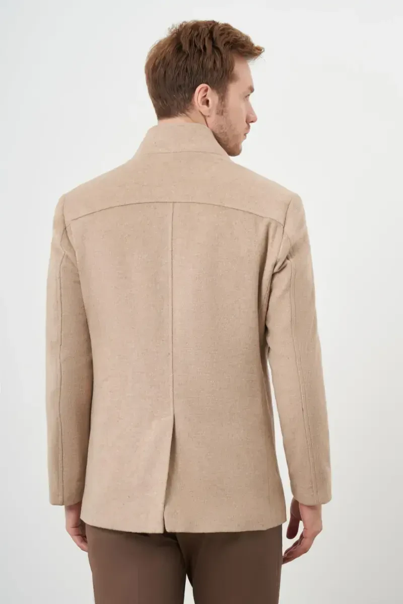 Stone Color Wool Mandarin Collar Men's Jacket - Regular Fit