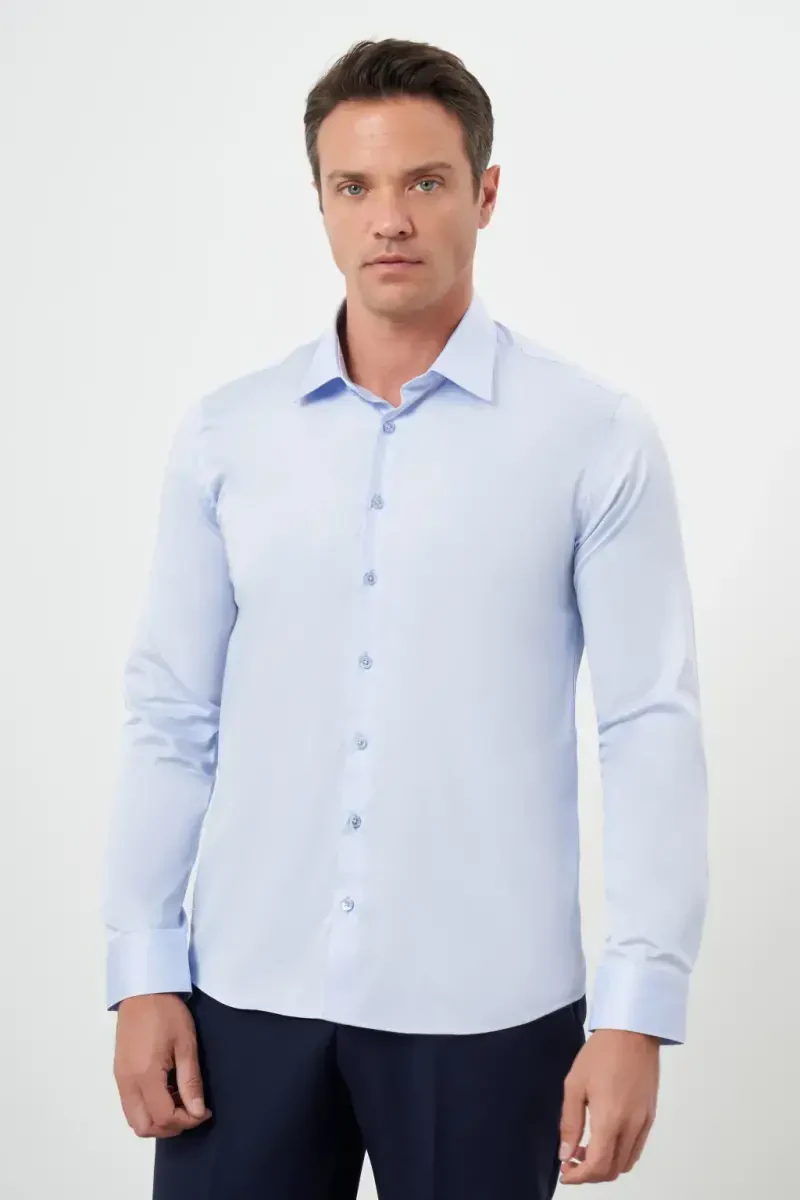 Мужская рубашка, синяя рубашка, хлопковая рубашка, рубашка slim fit, рубашка с простым узором, рубашка с жестким воротником, рубашка с длинными рукавами, ModaZon, мужская одежда, хлопковая рубашка
