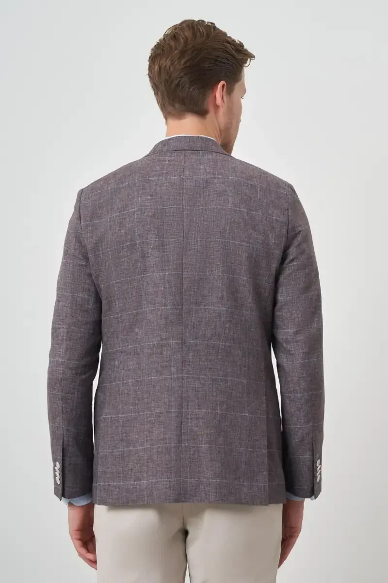 Мужской Кофе Льняной Клетчатый Приталенный Пиджак | Мода Зоны