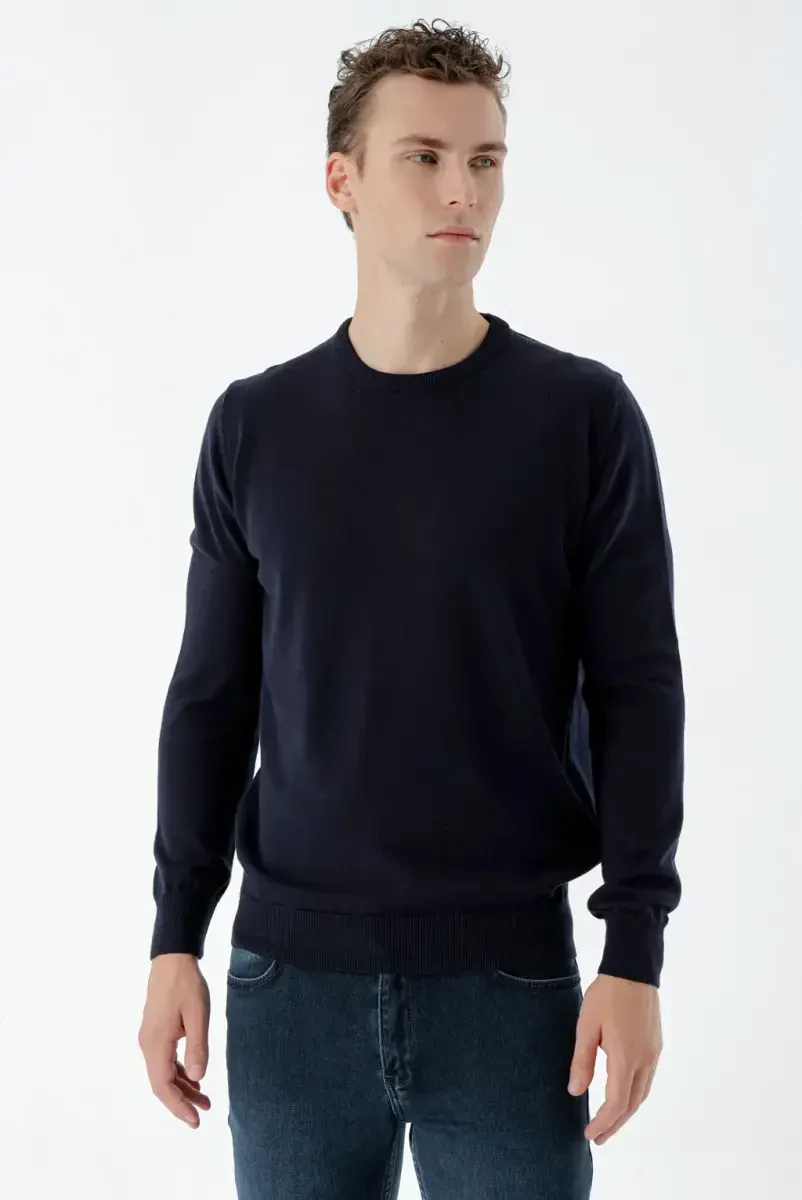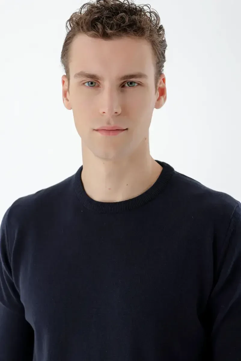 Мужской трикотаж, темно-синий трикотаж, круглый вырез горловины, dynamic fit, удобный крой, повседневная одежда, мужская одежда, трикотаж, ModaZOne, базовый трикотаж
