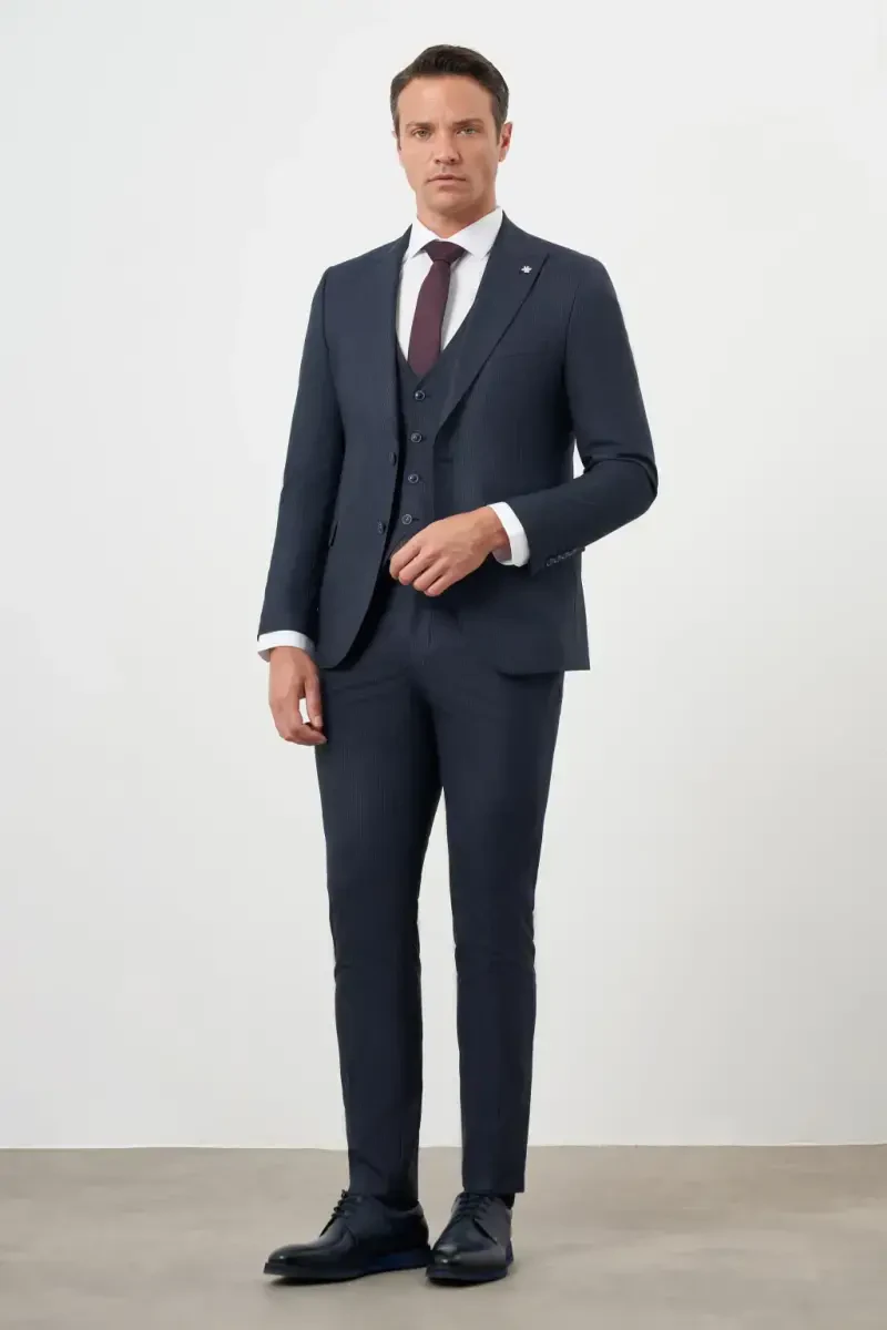 Мужской костюм, синий костюм, приталенный костюм, полосатый костюм, костюм-тройка, костюм из поливискозы, костюм с острым лацканом, модный костюм, модная мужская одежда, костюм для особых случаев