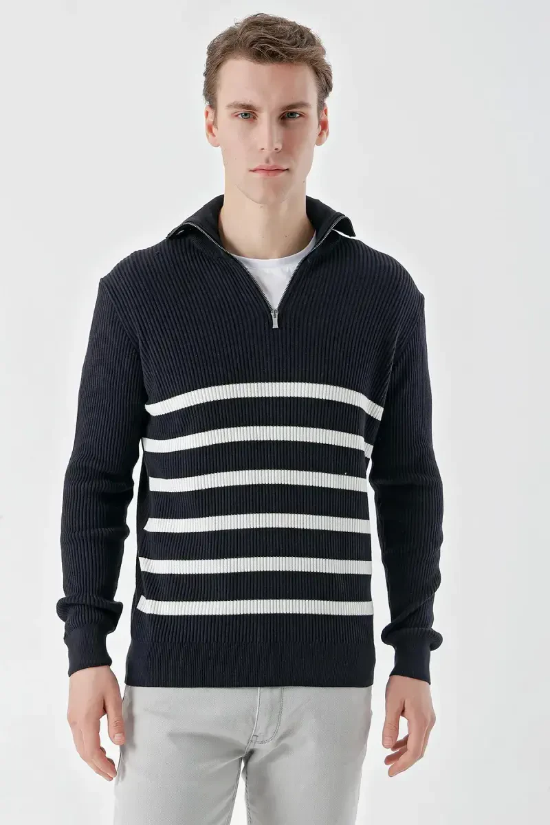 Мужской темно-синий трикотаж ModaZ one на молнии с воротником-стойкой, динамичного кроя и удобной посадки в трендовую полоску — это специальный дизайн, отражающий стиль современного мужчины. Неподвластная времени элегантность темно-синего цвета в сочетании с трендовым полосатым узором придает трикотажу динамичный вид. Воротник-стойка на молнии не только придает стильный вид, но и позволяет создавать различные комбинации. Вы можете получить более официальный стиль, полностью застегнув молнию, или более спортивный вид, оставив ее открытой. Динамичный крой мягко облегает линии тела, создавая стильный силуэт. Благодаря удобному крою он не ограничивает вашу свободу движений в течение дня и обеспечивает комфортное использование. Высококачественная трикотажная ткань с мягкой текстурой ласкает вашу кожу и обеспечивает длительный срок службы. Этот трикотаж легко сочетается с джинсами, брюками чинос или тканевыми брюками. Он поможет вам подчеркнуть свою элегантность и стиль в повседневной жизни, на работе или на особых мероприятиях. Вы можете носить его отдельно в холодную погоду или под куртку или пальто в более холодную погоду. Этот трикотаж, произведенный с качеством ModaZ one, станет незаменимой частью вашего гардероба на долгие годы. Этот трикотаж, каждая деталь которого тщательно продумана, — идеальный выбор для мужчин, которые следят за последними тенденциями мужской моды и хотят быть стильными. В любой момент, когда вы захотите почувствовать себя особенным и стильным, мужской темно-синий трикотаж ModaZ one на молнии с воротником-стойкой, динамичного кроя и удобной посадки в трендовую полоску будет сопровождать вас. Обязательно попробуйте этот трикотаж, чтобы обогатить свой гардероб и отразить свой стиль.