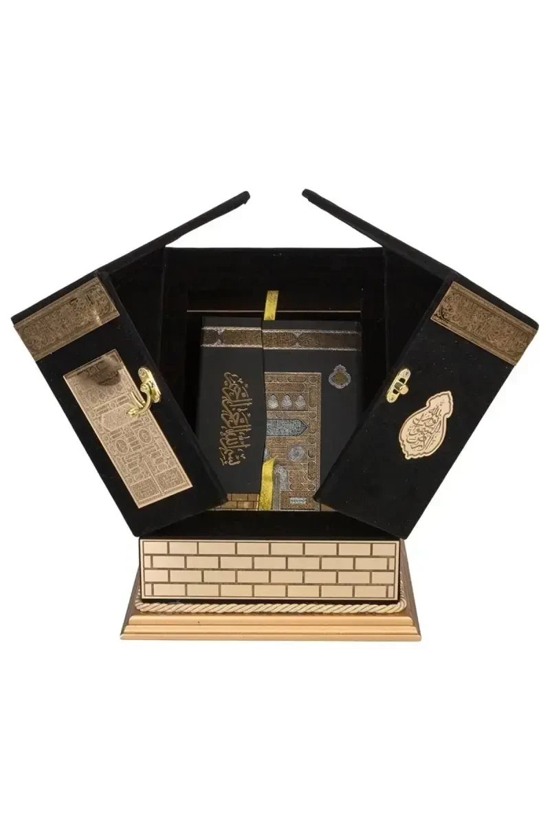 Модель Каабы изысканно изготовлена из плюшевого бархата и спроектирована как подробная копия настоящей Каабы. Украшенная золотыми украшениями и задрапированная черной тканью Кисьва, эта миниатюра привносит дух паломничества Хадж в ваш дом. Коран размера Хафиз написан красивым шрифтом и представлен в удобном для чтения формате.