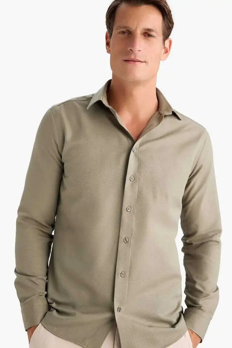 polo yaka gömlek, modern fit gömlek, poplin gömlek, uzun kollu gömlek, haki gömlek