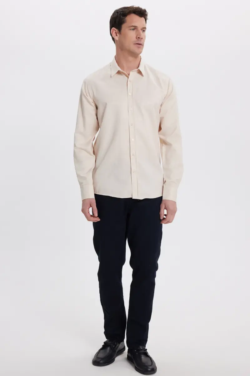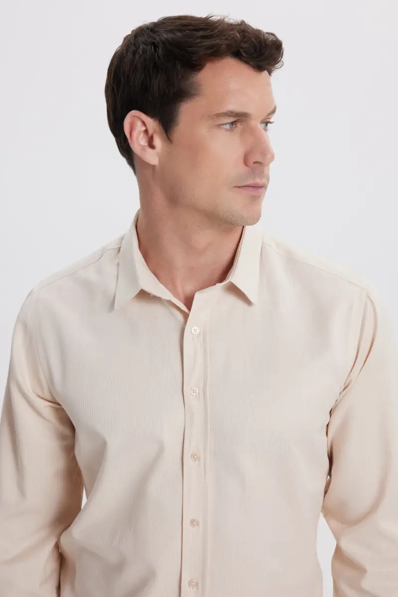 Modern Slim Fit Uzun Kollu Pamuklu Kolay Ütü Armürlü Bej Erkek Gömlek-Bej1