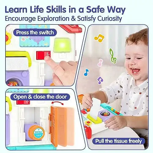 busy board, 1 year old girl toys, montessori toys, baby toys, 1 year birthday gift, monlekids, light and music toy, sensory toy, fine motor skills, hand-eye coordination, problem solving skills, creativity