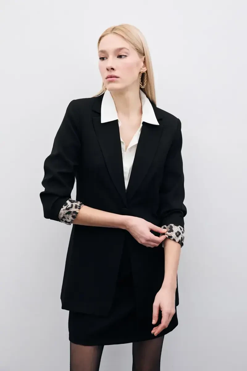 Mono yoqali kurtka, klassik kurtka, qora kurtka, ayollar kurtkasi, zamonaviy kurtka, ofis kurtkasi, kundalik kurtka, uzoq umr ko'radigan kurtka, oson dazmollanadigan kurtka, trend kurtka