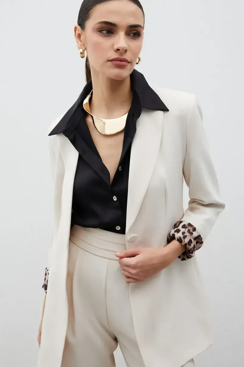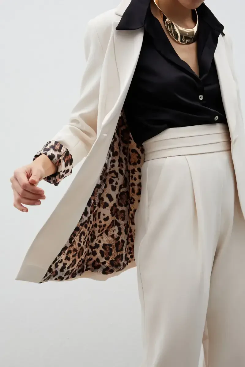 Mono Yaka Klasik Ceket, modern ve klasik çizgileri bir araya getiren özgün bir tasarıma sahiptir. Taş rengi, bu ceketi çok yönlü kılarak farklı kıyafetlerle kolayca kombin yapabilmenizi sağlar. İster jeanlerle rahat bir şıklık yakalayın, ister klasik bir elbiseyle sofistike bir görünüm elde edin, bu ceket her zaman stilinizi tamamlayacaktır. Ceketin en dikkat çekici özelliklerinden biri ise leopar desenli astarıdır. Bu detay, cekete hem eğlenceli hem de cesur bir dokunuş katarken, giyen kişiye özgüvenli bir duruş kazandırır. Mono yaka tasarımı, ceketin modern ve minimalist bir havaya sahip olmasını sağlar. Bu yaka detayı, ceketin genel görünümünü zarif bir şekilde tamamlar ve farklı aksesuarlarla kolayca kişiselleştirilebilir. Ceket, kaliteli kumaşı sayesinde uzun ömürlü bir kullanım sunar. Dikiş detaylarına gösterilen özen, ceketin üzerinizde kusursuz bir şekilde durmasını sağlar. Hem iç hem de dış mekanlarda rahatlıkla kullanabileceğiniz bu ceket, mevsim geçişlerinde ideal bir seçenektir. İster ofiste, ister bir akşam yemeğinde, isterse de günlük bir gezintide giyin, Mono Yaka Klasik Ceket her zaman şıklığınızı ön plana çıkaracaktır. Bu ceket, sadece bir giysi değil, aynı zamanda bir ifade biçimidir. Tarzınızı yansıtmak ve fark yaratmak isteyenler için mükemmel bir seçimdir. Leopar desenli astarın sürpriz etkisi, ceketi sıradanlıktan uzaklaştırırken, taş rengi klasik ve zamansız bir görünüm sunar. Bu ceket ile gardırobunuza hem modern hem de klasik bir dokunuş katabilirsiniz. Kısacası, Mono Yaka Klasik Ceket, stil sahibi kadınların gardırobunda mutlaka bulunması gereken bir parçadır. Hem şık hem de rahat olan bu ceket, her ortamda kendinizi iyi hissetmenizi sağlayacak. Özgün tasarımı, kaliteli malzemesi ve çok yönlü kullanım özellikleriyle bu ceket, uzun yıllar boyunca favori parçanız olmaya adaydır.