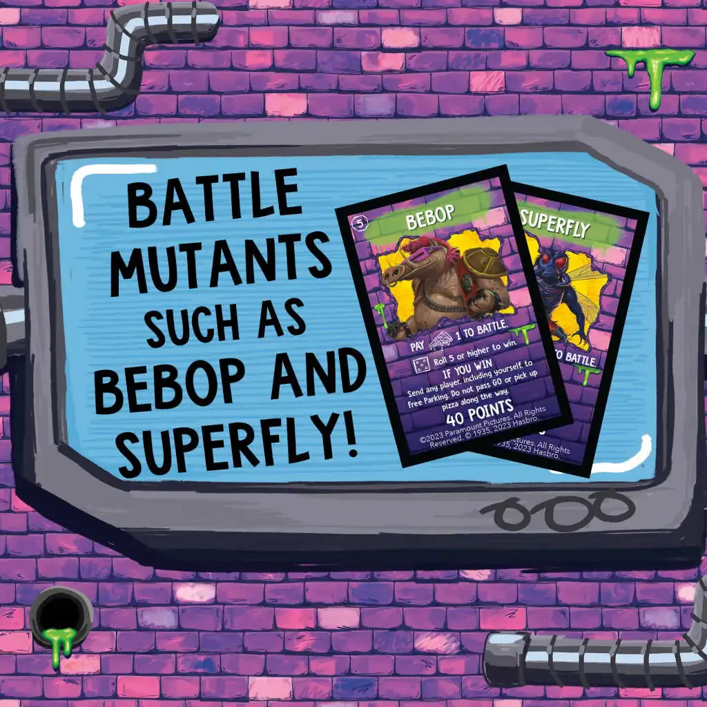 O'yin quyidagilarni o'z ichiga oladi: O'yin taxtasi, 4 ta personaj tokeni, 4 ta personaj kartasi, 4 ta ma'lumotnoma kartasi, 8 ta Mutant jangi kartasi, 16 ta Mulk kartasi, 1 ta raqamli zar, stiker varag'i bilan 1 ta Ninja harakati zari, 90 ta Pizza (55 ta pizza bo'lagi, 40 ta pizza) va O'yin qo'llanmasi. 8 yosh va undan katta. 2 dan 4 gacha o'yinchi uchun. Mualliflik huquqi 2022 Viacom International Inc. Barcha huquqlar himoyalangan. Nickelodeon, Teenage Mutant Ninja Turtles va barcha tegishli nomlar, logotiplar va personajlar Viacom International Inc.ning savdo belgilari hisoblanadi. Hasbro va Monopoly nomlari va logotiplari, o'yin taxtasining o'ziga xos dizayni, to'rtta burchak kvadrati, janob Monopoly nomi va personaji, shuningdek taxtaning va o'yin qismlarining har bir o'ziga xos elementi Hasbro'nun mulk savdosi o'yini va o'yin uskunalari uchun savdo belgilari hisoblanadi.