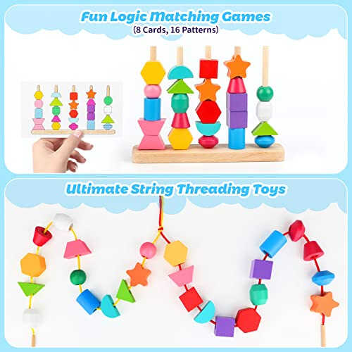 【Multifunctional Montessori Toys】Our wooden toys comes with 25 X colorful wooden beads with various shapes, 1 X wooden stand, 2 X laces with wooden stick, and 8 X double-sided pattern cards. There are multiple ways to play our Montessori toys for 3 year old: Stacking & matching wooden blocks on the wooden stand according to the pattern cards, threading beads, stacking up wooden blocks, or combining the blocks into a new patterns. Valued learning toys to make kids have a huge fun. 【Fun Bead Sequencing Games】Choose one card randomly, and then game starts! Based on the beads sequence of the card, kids stack up the wooden blocks on the correct position of the wooden stand. Playing this matching games help kids to enhance their problem-solving skills, logical thinking and observation ability. An interesting brainteaser game for toddler to challenge! 【Threading Toy for Toddlers】The laces have a small wooden stick, which is simple for a toddler to thread beads into the string. Easy operation will arouse toddlers’ interests in this wooden lacing toys. Moreover, the beads come with 12 colors and 11 shapes. Children can learn colors and shapes during their preschool period. Great toddler manipulatives, preschool learning activities and stem toys for 3 year old. 【Fine Motor Skill Toys】Sequencing blocks, stringing beads, stacking, sorting, counting, color matching, shape recognizing, or lacing beads as a necklace making kit, our blocks for toddlers are great preschool toys 3-5 to develop kids’ hand-eye coordination, dexterity and fine motor skills. Imagination and creativity will also be aroused. Perfect stacking toys and montessori toys for 4 year old boys girls. 【Ideal Gifts for Boys Girls】The wooden montessori toys set is made of non-toxic wooden material, durable and safe for kids. All wooden blocks are lightweight, suitable for toddlers' small hands to grasp. It’s an ideal gift for kids age 2 3 4 5. Nice toddler toys age 2-4, lacing beads for kids ages 3-5, developmental wooden toys for 2 year old boy girl.