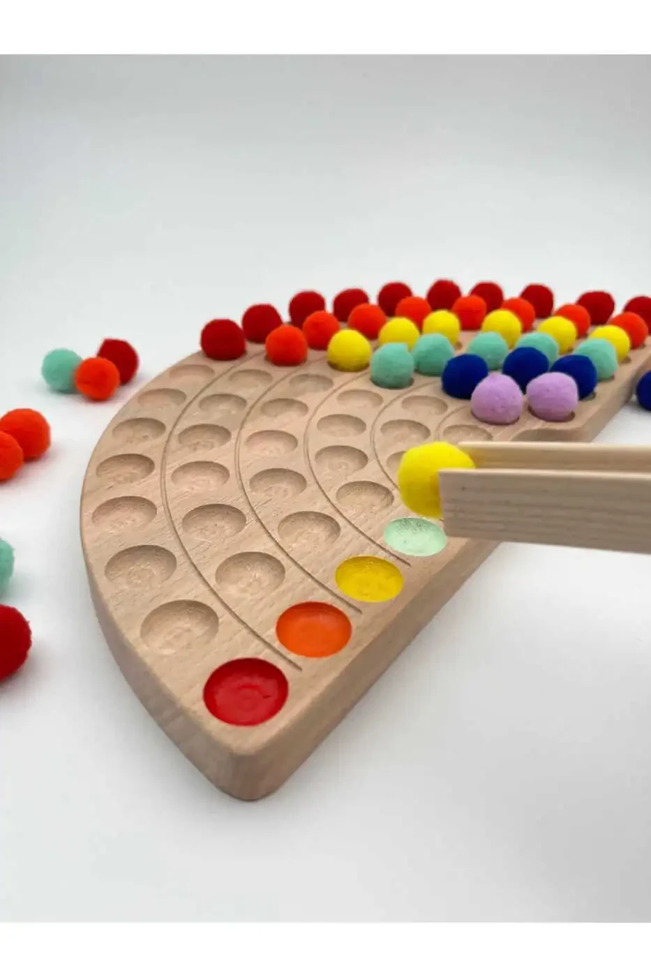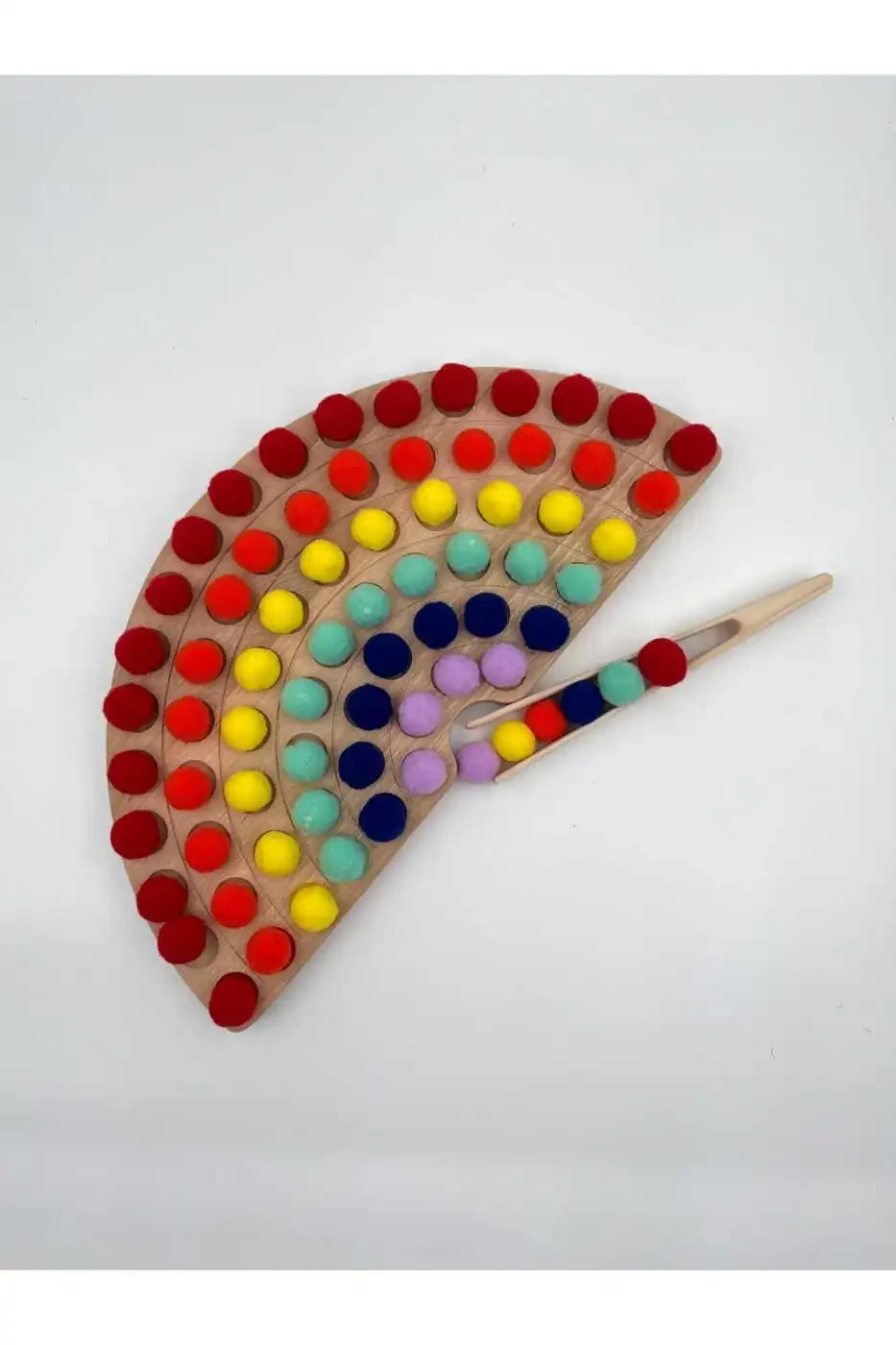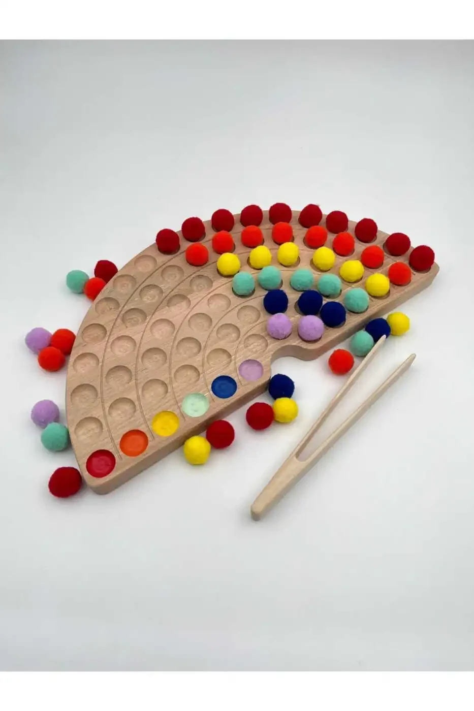 The Montessori Educational Wooden Toy - Wooden Rainbow and Colorful Felt Balls is a perfect way to nurture your child's imagination and creativity, while also supporting their development of fine motor skills, colors, and shapes.