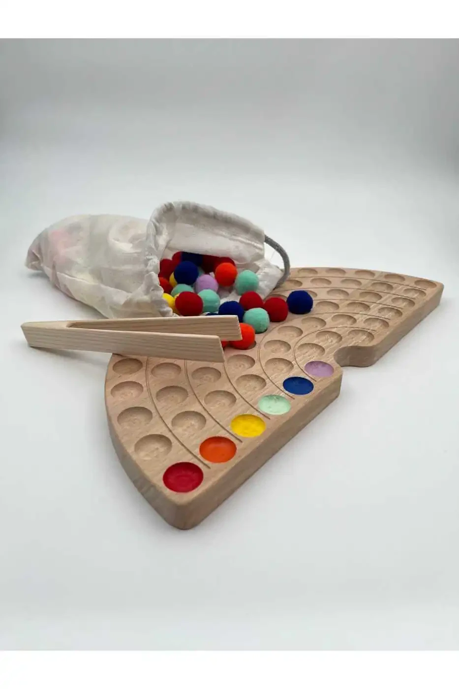 The wooden rainbow allows your child to learn colors and use their imagination to create their own games. The colorful felt balls help your child develop fine motor skills. Activities such as placing and removing the balls on the rainbow, arranging and grouping them help your child develop hand-eye coordination, problem-solving skills, and attention span.
