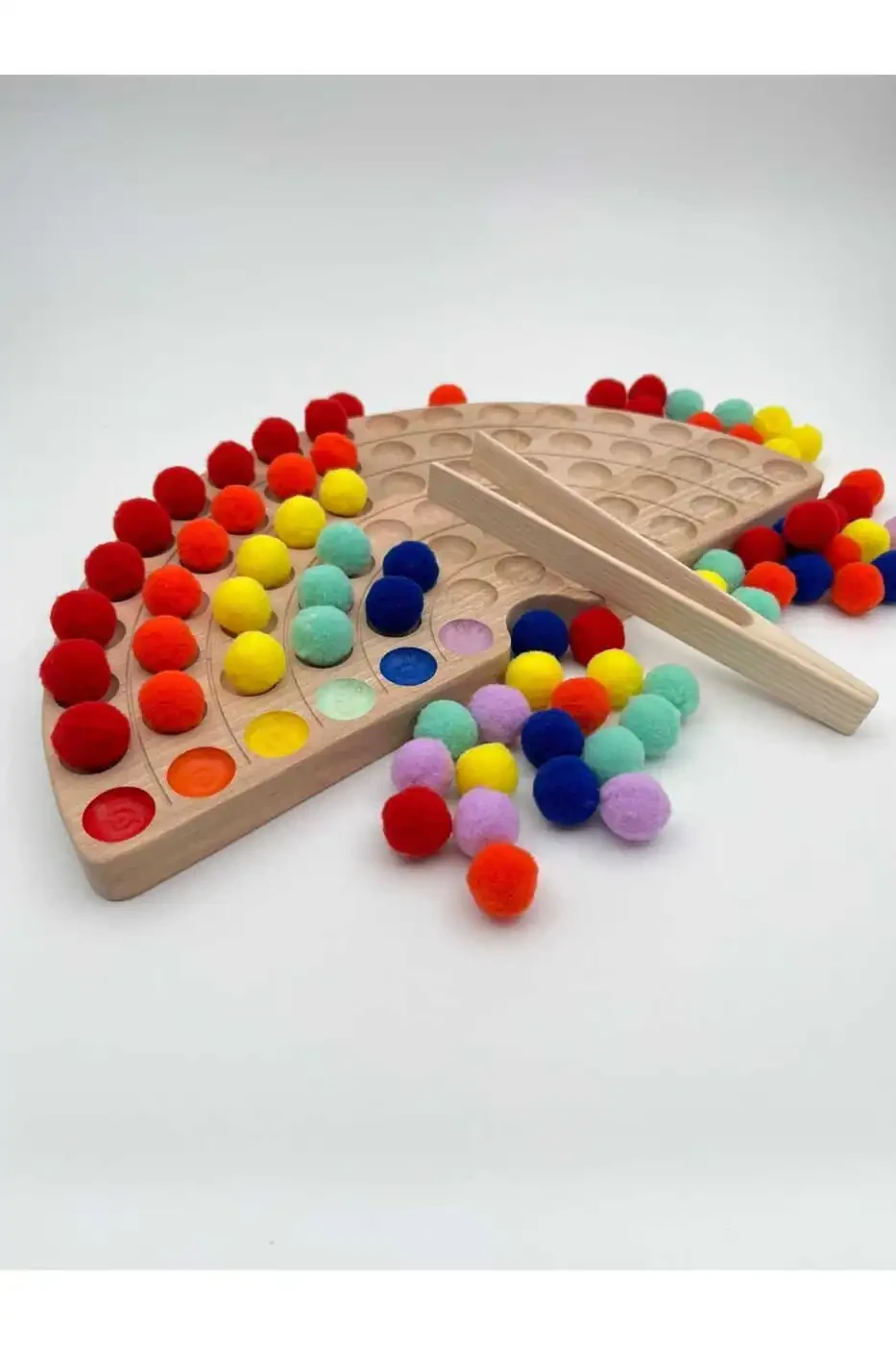 Монтессори-игрушка из дерева - деревянная радуга и разноцветные войлочные шарики - это идеальный способ развить воображение и творчество вашего ребенка, а также поддержать его развитие мелкой моторики, цветов и форм.