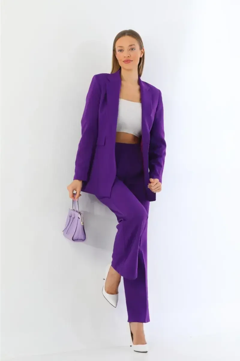 Mor blazer ko'ylagi, palazzo shimlar kostyumi, ayollar kostyumi, zamonaviy kostyum, ofis kiyimi, taklif kombinatsiyasi, baland belli shim, keng shim, bitta tugmali ko'ylagi, dazmollashni talab qilmaydigan kostyum