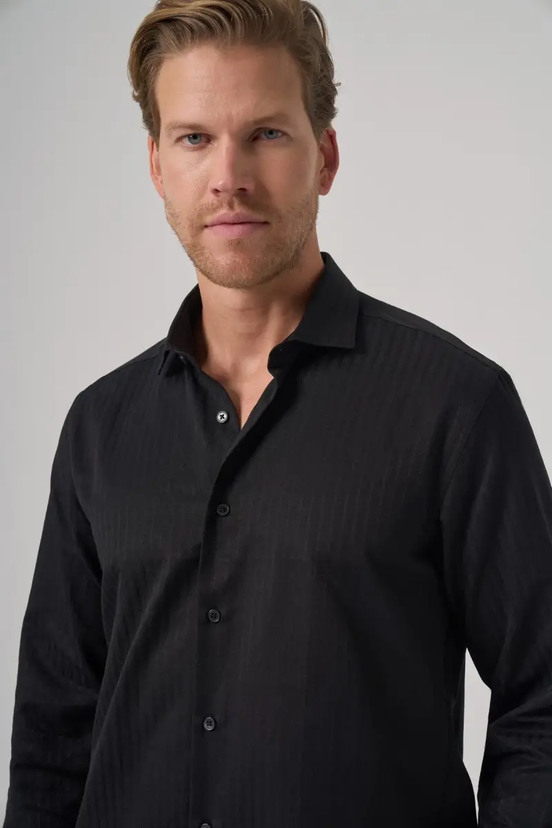 Slim Fit Polo Collar Poplin Long Sleeve Cotton Shirt Black