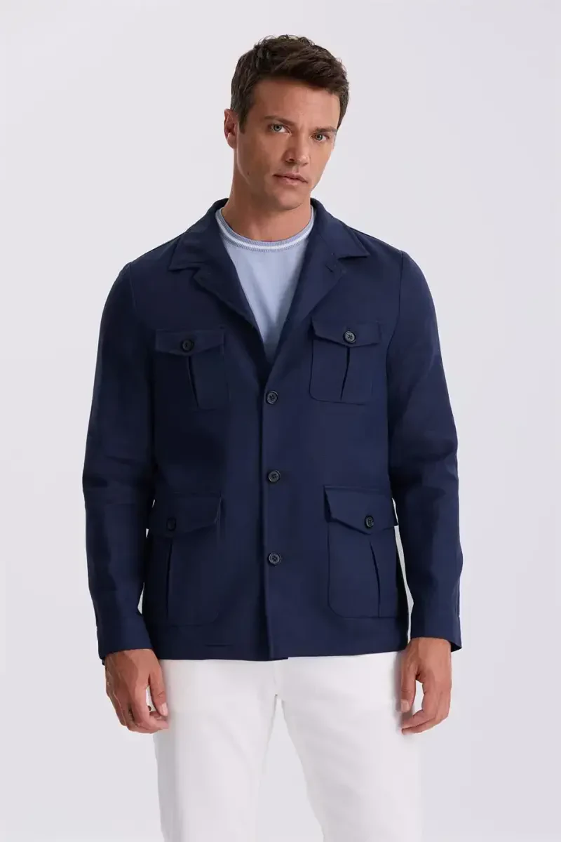 To'q ko'k rang Slim Fit cho'ntakli zig'ir paxtadan yasalgan fasllar uchun safari kurtka | 50% zig'ir 50% paxta