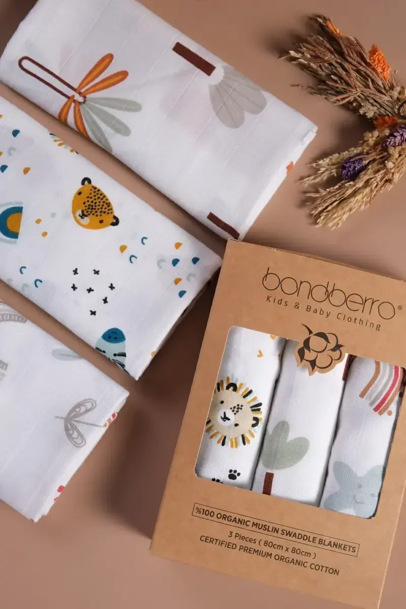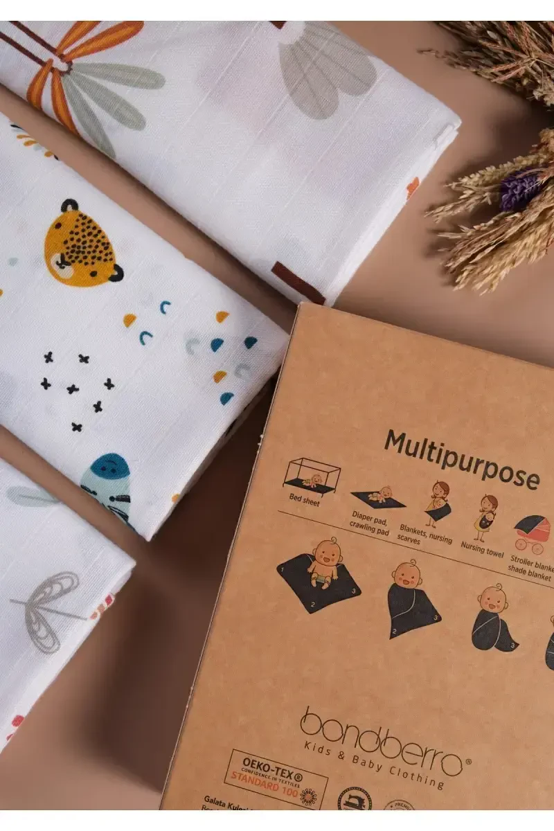 We present to you a special product that will add elegance, comfort, and utility to your homes while prioritizing your baby's health! The Multi-Purpose Muslin Cover & Blanket 3-Piece Set is made of 100% cotton, Oeko-Tex certified, with dimensions of 80x80 cm, decorated with cute animal patterns, and has antibacterial properties, lightweight, and easy to carry. This special set is presented with the assurance of bondberro and is designed to make both your babies' and your lives easier. This unique product offered at a campaign price is available in limited stock. You can take advantage of this opportunity by ordering now! The product's selling price is determined by the seller, but it is presented with bondberro's quality and affordable price guarantee. A product can be sold by multiple sellers; however, bondberro always prioritizes the quality of the product and customer satisfaction. The ranking is made by evaluating factors such as price, seller score, delivery status, promotions, shipping fee, fast delivery, and stock information among the products offered for sale by multiple sellers. You can be sure that you will receive the best service with bondberro's assurance when purchasing the Multi-Purpose Muslin Cover & Blanket 3-Piece Set. You can order a maximum of 5 pieces of this product. Trendyol reserves the right to cancel orders over 5 pieces. This limit does not apply to corporate orders, and different limits may apply for corporate orders. If you are not satisfied with our product, you can take advantage of the free return opportunity within 15 days. Please click to get detailed information about the return conditions. This set offers versatile use beyond just a cover or blanket. You can use it when changing your baby's diaper, breastfeeding, in the stroller or car seat, and also as a play cover. It is a lifesaver that you will not want to leave behind during your travels or when spending time outside. Thanks to its 100% cotton structure, it gently touches your baby's skin and does not cause irritation. At the same time, its breathable structure prevents sweating and ensures that your baby is comfortable. Its antibacterial properties provide protection against germs and bacteria, offering hygienic use. Its stylish animal patterns attract your baby's attention and add color to the room. Its vibrant and fun patterns support your baby's development while also harmonizing with the decoration of their room. It can be easily folded with its lightweight structure and does not take up much space in your bag or baby care bag. It is extremely practical to carry with a weight of 0.99 kg. The fact that it is made of high-quality cotton material ensures that the product is long-lasting. When washed according to the gentle washing instructions at 30 degrees, it maintains its quality as on the first day. Thanks to the 3-piece package content, you will have numerous covers that you can use for different purposes. It is a practical and useful set that will be with you whenever you need it. This product, presented with the assurance of bondberro, is designed for your baby's and your comfort. Order now and experience this unique experience!
