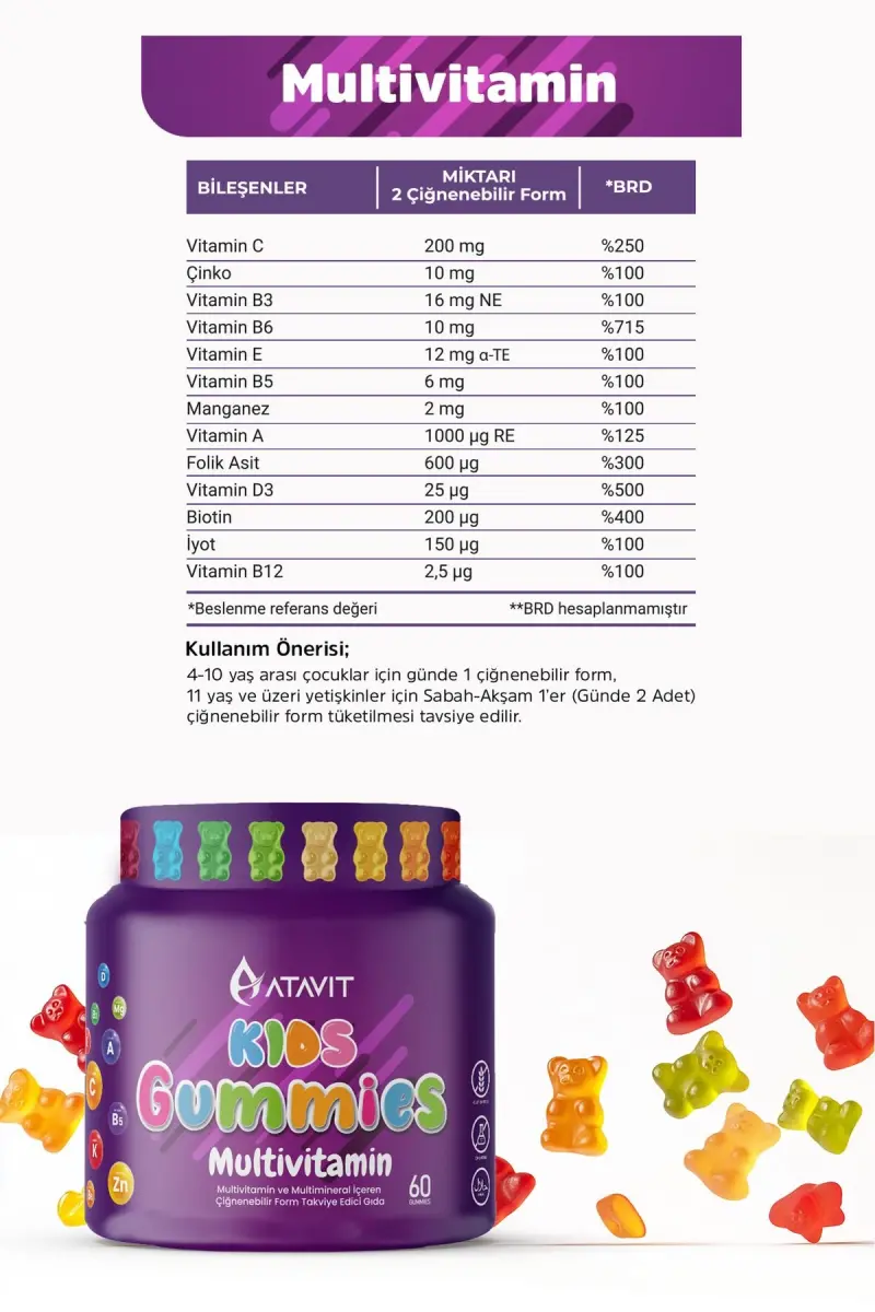 multivitamin, çocuk, vitamin, gummıes, sakız, a, c, e, d3, b3, b5, b6, b12, biotin, iyot, sağlık, büyüme, gelişme, bağışıklık sistemi, enerji, doğal, glutensiz, şekersiz