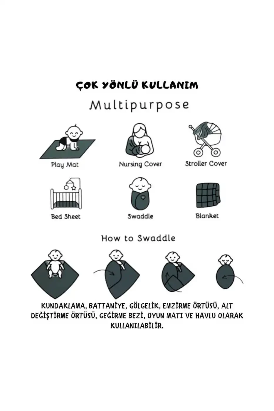 - Usage Areas: Can be used as a baby blanket, swaddle, breastfeeding cover, play mat, car cover, diaper changing cover.