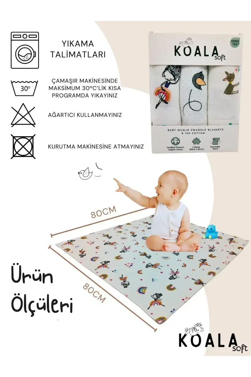 Наш набор из 3 муслиновых пеленок - один из основных продуктов, которые понадобятся вашему малышу с первых дней жизни. Легкость и дышащая структура муслиновой ткани, сертифицированной Oeko-Tex, предотвращает раздражение кожи вашего ребенка и сводит к минимуму потоотделение. Благодаря этому ваш ребенок всегда чувствует себя сухо и комфортно. Узоры "Балерина, Птица и Газель" придают пеленкам элегантный и милый вид, а также создают приятную атмосферу в комнате вашего ребенка. Пеленки размером 80x80 см подходят для использования в кроватке вашего ребенка, в коляске или на игровом коврике. Кроме того, они достаточно легкие, чтобы брать их с собой в поездки. Натуральная структура муслиновой ткани становится еще мягче после каждой стирки, обеспечивая нежное прикосновение к коже вашего ребенка. Наш продукт не содержит никаких химических веществ, вредных для здоровья вашего ребенка. Как родители, мы считаем здоровье и безопасность вашего ребенка нашим главным приоритетом. Поэтому мы производим нашу продукцию в соответствии с высочайшими стандартами качества. Наш набор из 3 муслиновых пеленок - это не просто пеленка, это также инструмент, который укрепляет связь между вами и вашим ребенком, которым вы обнимаете его с любовью и лаской. Это прикосновение, которое останется в первых воспоминаниях вашего ребенка, даря ему мир и безопасность. Кроме того, это отличный подарок для новорожденных. Вы можете порадовать своих близких этим особенным и полезным продуктом. Наши муслиновые пеленки поддерживают режим сна вашего ребенка, защищают его от внешних воздействий и заставляют чувствовать себя в безопасности. Благодаря своей легкой структуре они не ограничивают движения вашего ребенка, позволяя ему свободно двигаться. Благодаря своей долговечности и прочности, это продукт, который вы сможете использовать долгие годы. Легко стирается и гладится, поэтому всегда остается чистым и гигиеничным. Наш набор из 3 муслиновых пеленок разработан для комфорта и счастья вашего ребенка и изготовлен из тщательно отобранных материалов. Он будет сопровождать вашего ребенка с первых моментов его жизни, будет другом, который обнимает его с любовью и лаской.