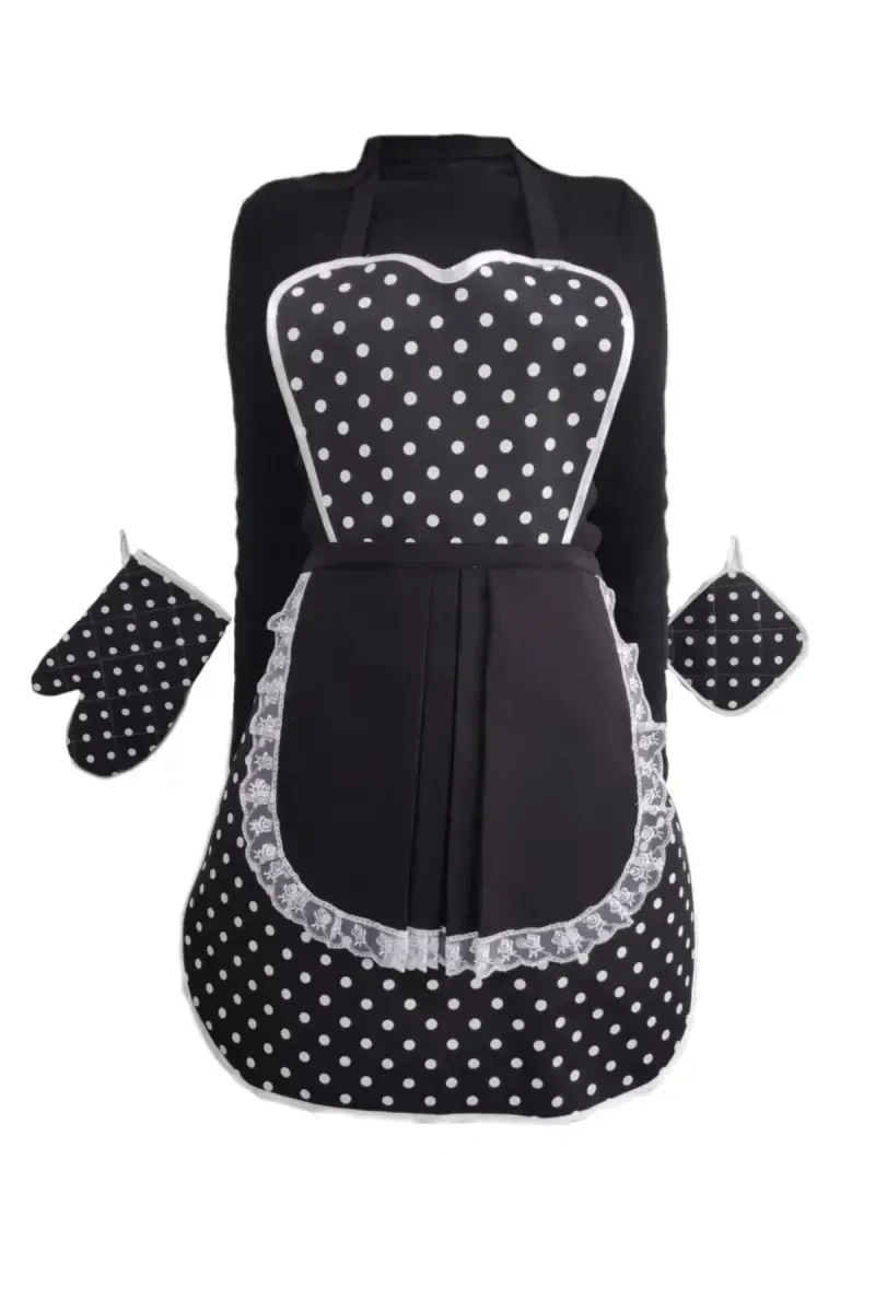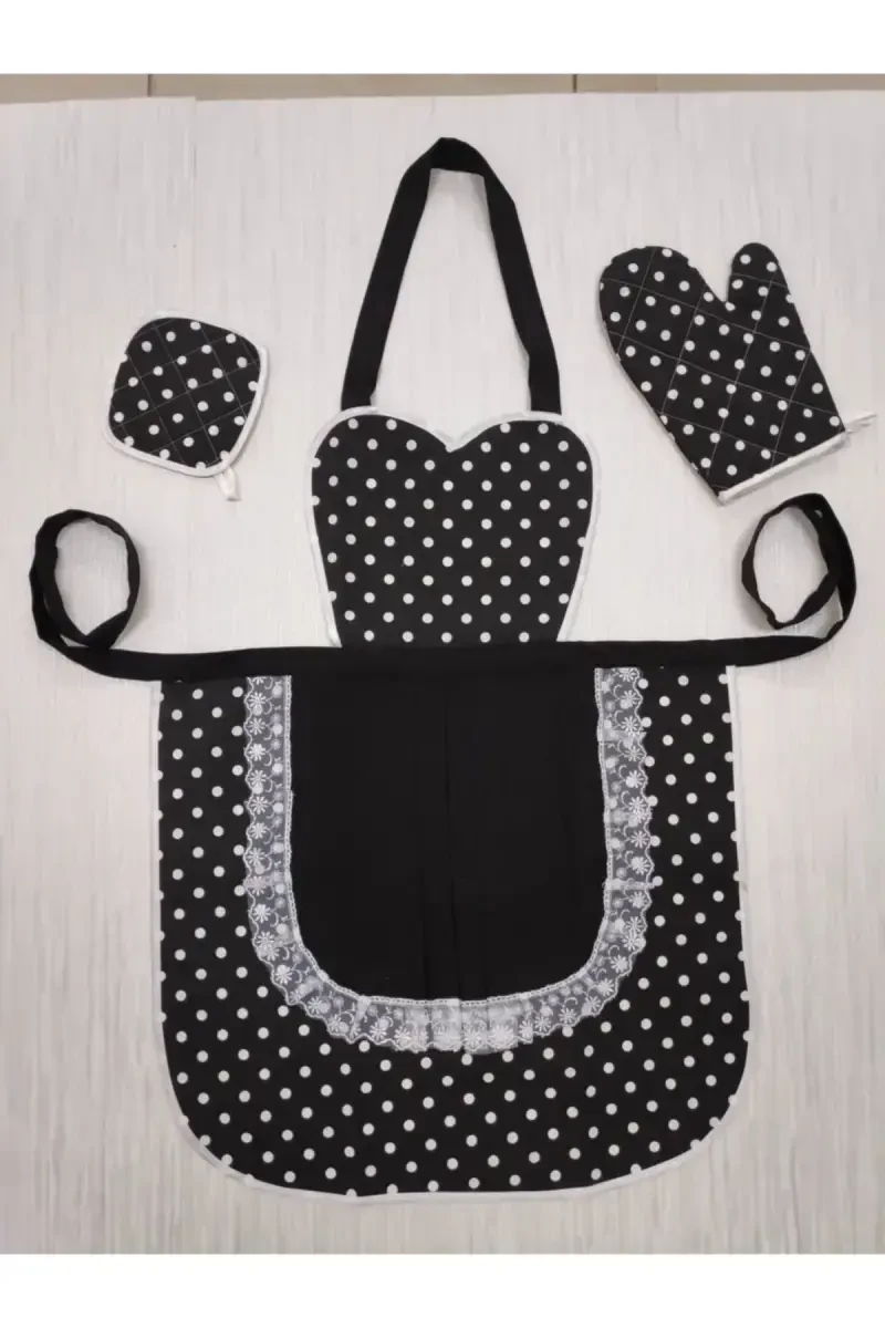 Kitchen Apron Pot Holder Glove Set Black Polka Dot Waterproof is an ideal set that combines elegance and safety in the kitchen. With its white polka dots on a black background, it adds a retro touch to your kitchen while protecting your clothes and hands safely thanks to its waterproof feature. The set includes a kitchen apron, a pot holder that allows you to easily hold hot pots and pans, and an oven mitt, making your time in the kitchen more enjoyable and safe. Made of high-quality material, it offers long-lasting use. It is an excellent option for both daily use and special occasions. It is a must-have product for those looking for elegance and practicality in the kitchen.Product DescriptionProtect your elegance and ensure your safety in the kitchen with the Kitchen Apron Pot Holder Glove Set. This set, which adds a retro touch to your kitchen with its black polka dot design, protects your clothes and hands from unwanted splashes thanks to its waterproof feature. The kitchen apron in the set provides a comfortable use and adapts to every body thanks to its adjustable straps. The pot holder and oven mitt minimize the risk of burns by allowing you to safely touch hot surfaces. Made of high-quality and durable materials, this set will be one of your most reliable helpers in the kitchen for many years. Whether you buy it for yourself or give it to your loved ones, this stylish and useful kitchen set will be appreciated by everyone. Its black polka dot pattern adds vitality to your kitchen, while its waterproof feature offers practical use. Each piece of the set is carefully designed to make your time in the kitchen more enjoyable and efficient. The wide pocket on the kitchen apron allows you to easily store your recipe book or kitchen utensils. The pot holder and oven mitt are made of heat-resistant material and provide maximum protection against high temperatures. With this set, you can reflect your elegance and style both while cooking and serving. The Kitchen Apron Pot Holder Glove Set is not just a kitchen utensil, but also an accessory that adds value to your kitchen. Moreover, it always offers hygienic use thanks to its easy-to-clean structure. It is an ideal choice for those looking for a professional touch in the kitchen. This set can be an excellent gift option for anyone who loves cooking in the kitchen. It is a stylish and useful alternative designed for birthdays, housewarming gifts or special occasions. Experience both elegance and safety in the kitchen with the Kitchen Apron Pot Holder Glove Set.Product Features* Stylish black polka dot design* Waterproof feature* Adjustable kitchen apron straps* Heat-resistant pot holder and oven mitt* High quality and durable material* Easy-to-clean structure* Wide pocket in the kitchen apron* Long lasting use* Retro kitchen atmosphere* Apron suitable for all sizesAdditional InformationSet includes: 1 kitchen apron, 1 pot holder, 1 oven mitt. Our product is made of high-quality materials and is long-lasting. Thanks to its waterproof feature, you can easily use it in the kitchen. It is easy to clean, can be washed by hand or in the machine. It will add a different atmosphere to your kitchen with its stylish design. It can also be preferred as a gift.