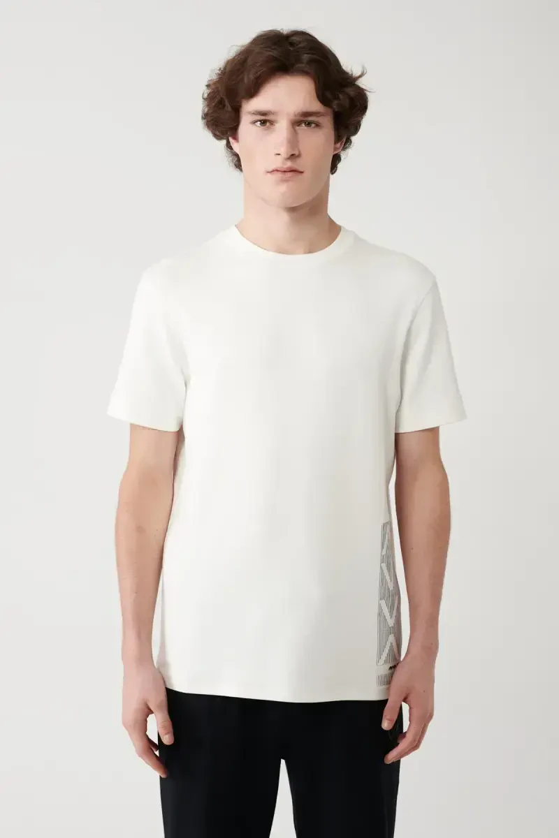 Мужская белая футболка с принтом, круглая горловина, мягкий хлопок, стандартная посадка A41y1328 - идеальный выбор для повседневного использования. Вы можете сочетать ее с джинсами, шортами или спортивными штанами, чтобы создать стильный и комфортный образ. Вы также можете выбрать ее для занятий спортом или выходов.
