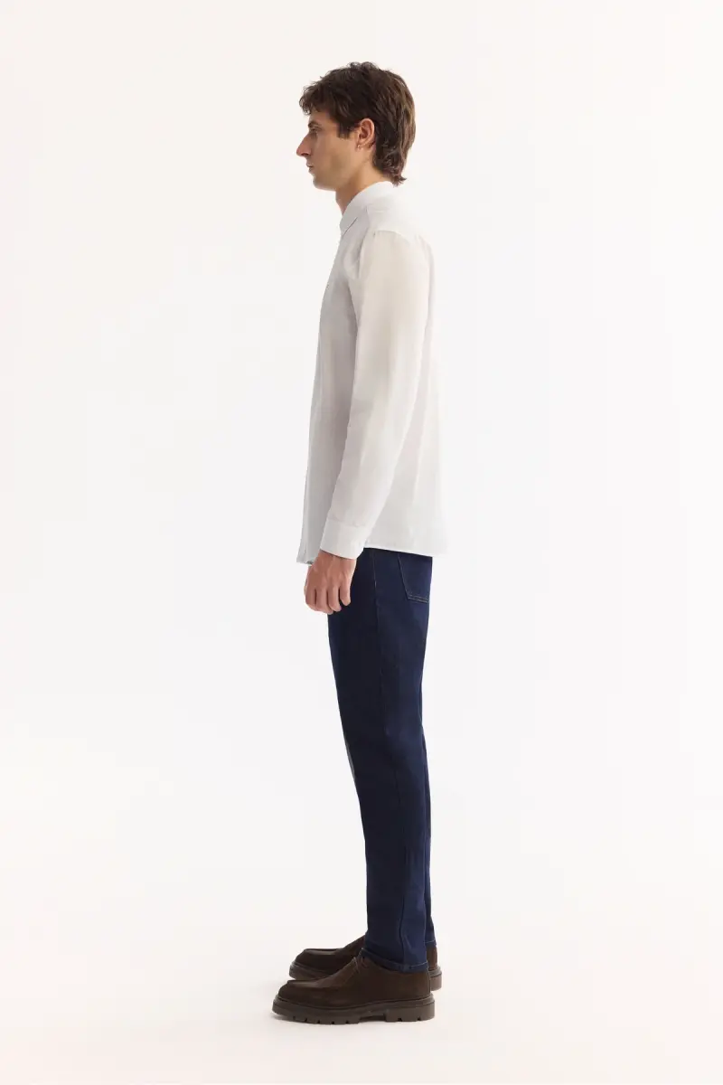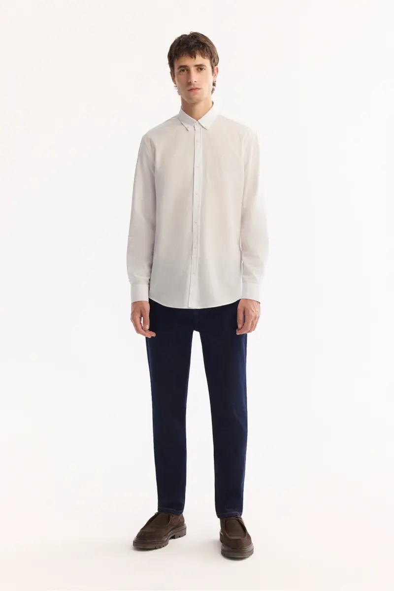 Эта белая рубашка, сочетающая в себе стиль и комфорт, является неотъемлемым элементом гардероба любого мужчины. Изготовленная из 100% хлопковой ткани с текстурой льна, она обеспечивает воздухопроницаемость и мягкость. Свободный крой обеспечивает комфорт в течение всего дня. Отложной воротник с пуговицами и длинные рукава придают ей классический вид.