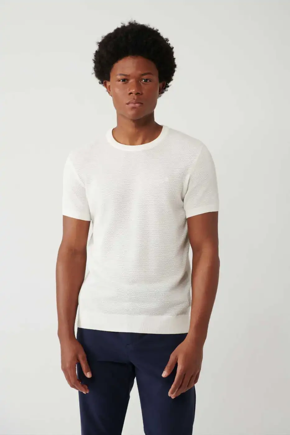 Белые футболки, неотъемлемая часть мужского гардероба, являются отличным выбором, сочетающим в себе стиль и комфорт. Особенно популярные в летние месяцы, белые футболки - это выбор, который дополняет ваши комбинации и адаптируется к любой обстановке. Эта Мужская белая трикотажная футболка из модального волокна, которую мы предлагаем, выделяется своим качественным составом ткани и особым дизайном.