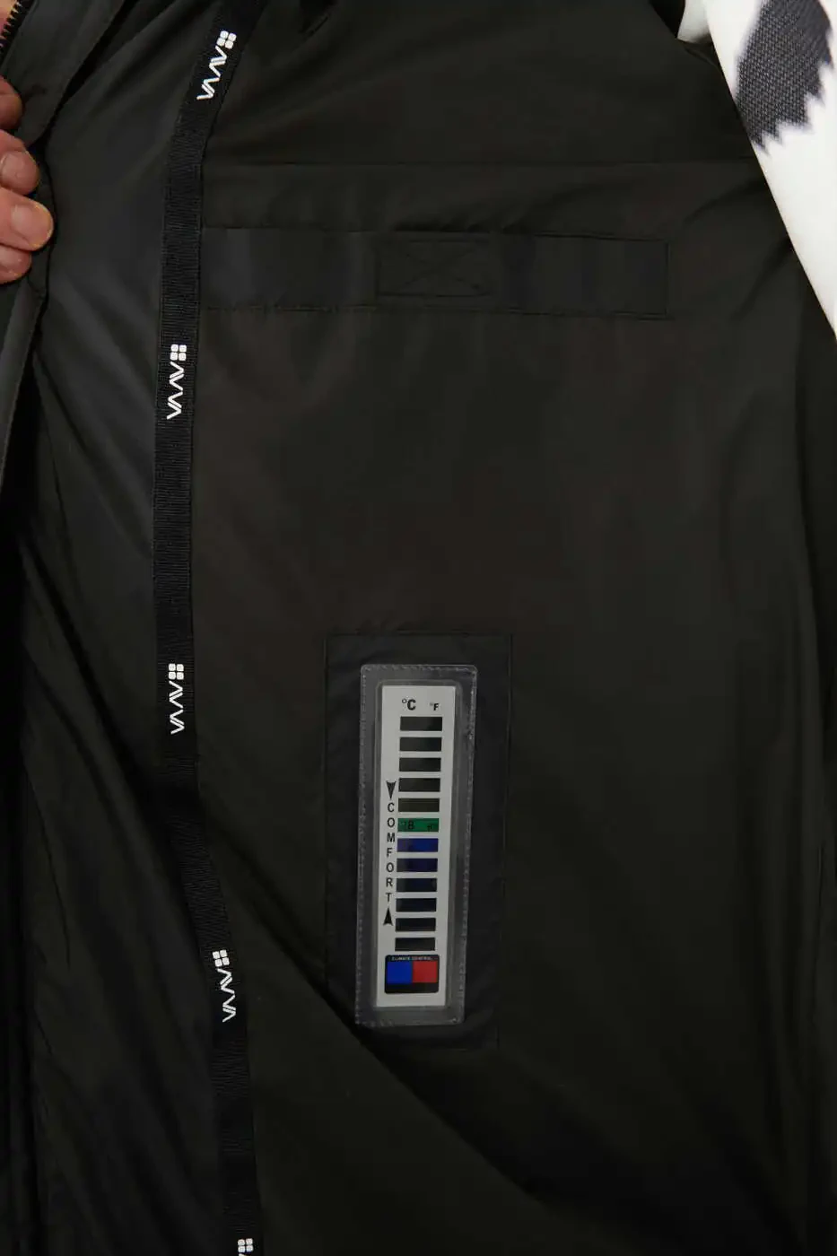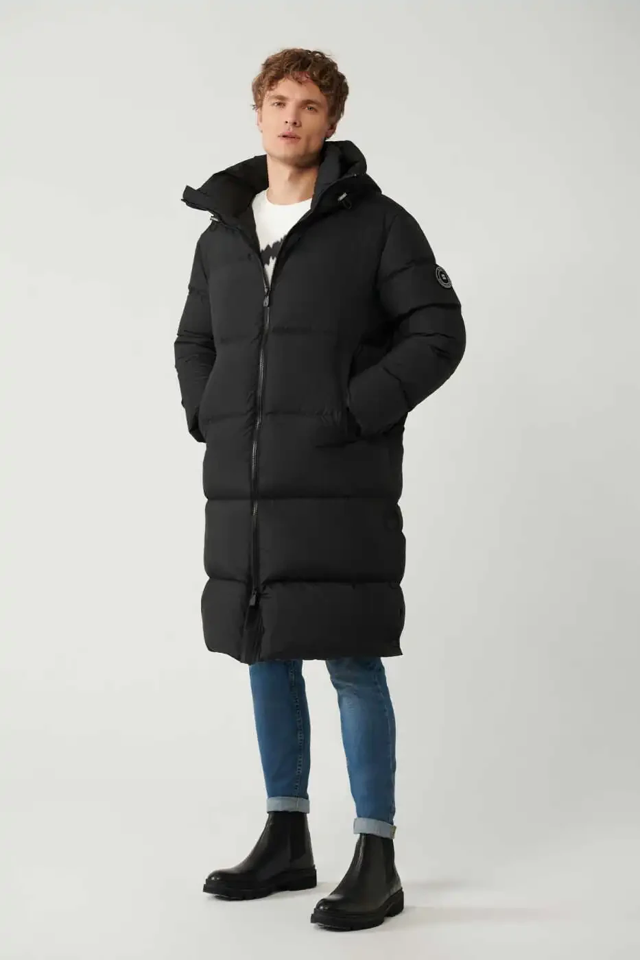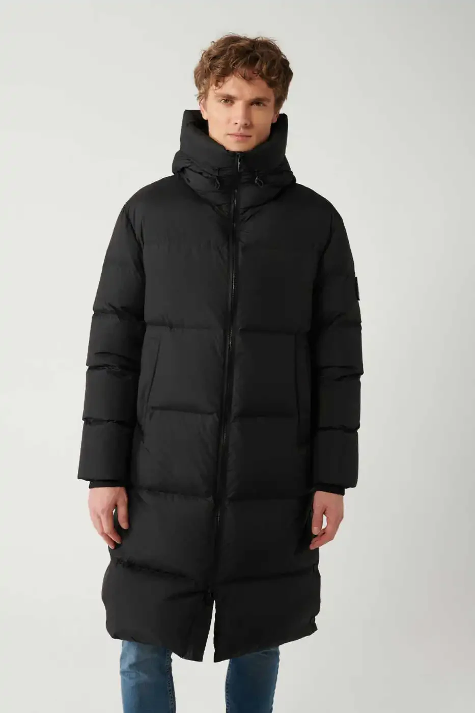 Капюшон с воротником, наполненный пухом, термометр, водоотталкивающий, ветрозащитный, функциональный многокарманный, с внутренним карманом на молнии и клапаном, с передней застежкой на молнию, боковые прорези на кнопках, длинное пуховое пальто