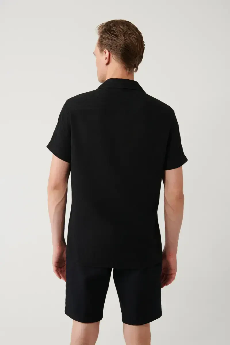 Мужская черная рубашка, разработанная для добавления изысканного штриха в ваш повседневный стиль, предлагает современный вид с деталью воротника Apaj. Короткие рукава и удобный крой, в сочетании с жаккардовой фактурной тканью, создают стильный и одновременно комфортный образ.