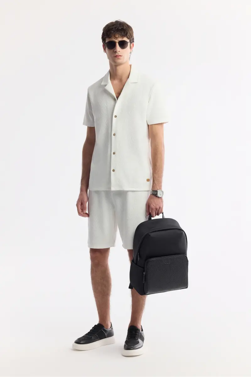 Экрю жаккардовая рубашка с воротником апаш для мужчин | Короткий рукав, стандартный крой