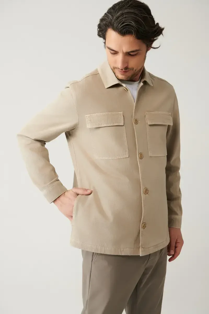 Сочетая в себе вневременный стиль и комфорт, Мужская бежевая классическая куртка с карманом с одеждой, окрашенной в Comfort Fit Denim, станет незаменимой частью вашего гардероба. Куртка из мягкой высококачественной джинсовой ткани, разработанная для адаптации к любой обстановке. Ее классический воротник и застежка на пуговицах спереди обеспечивают стильный вид, в то время как ее свободный крой обеспечивает комфорт в течение всего дня. Карманы позволяют при необходимости безопасно носить с собой ваши вещи. Благодаря обработке окрашивания ткани куртка имеет уникальный цветовой тон и винтажный вид, который добавит изюминку вашему стилю.