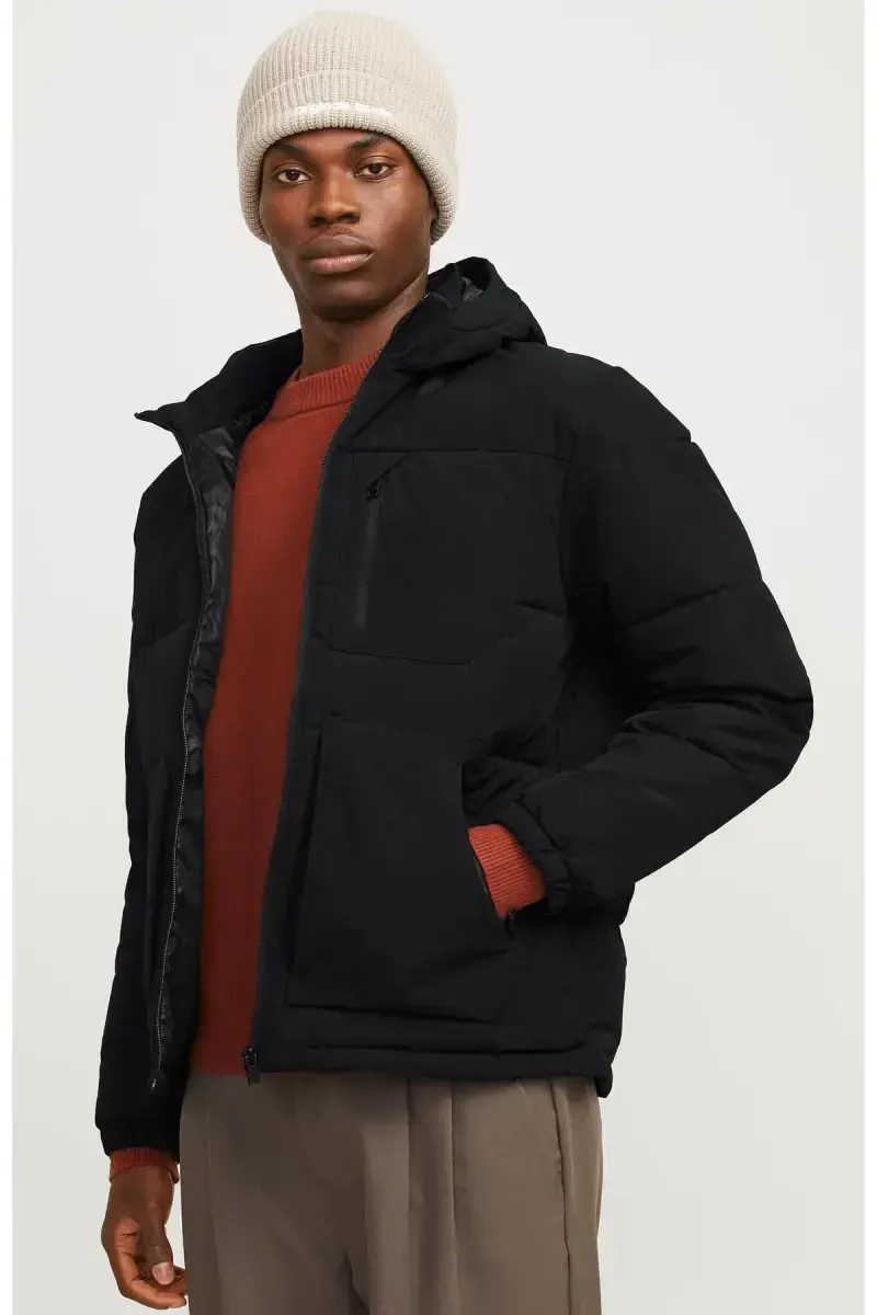 Водонепроницаемая и ветронепроницаемая куртка 12214648 Jcootto Puffer Men's Jacket Black идеально подходит для повседневной носки. Регулируемый капюшон и карманы на молнии повышают комфорт, одновременно придавая стильный вид.