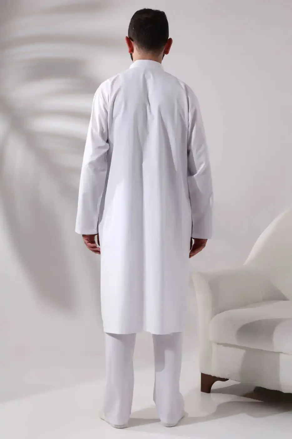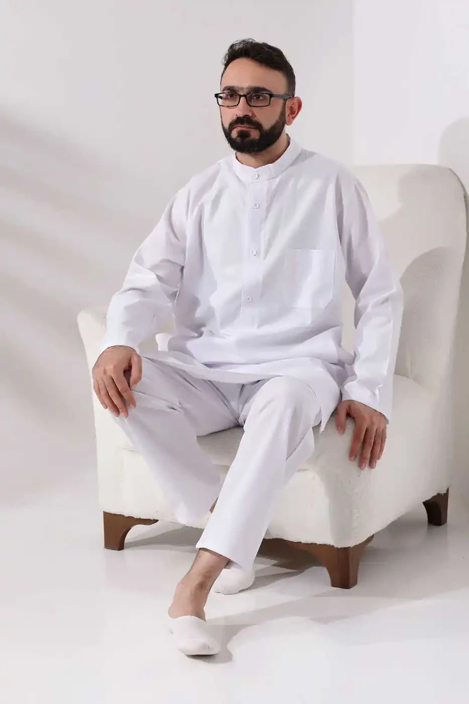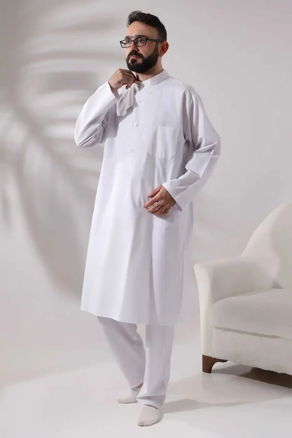 Мужской комплект для хаджа и умры из двух предметов, низ и верх, афганский, белый, обеспечивает вам как традиционный, так и удобный стиль во время совершения обрядов хаджа и умры. Этот особый дизайн, сочетающий в себе традиционный афганский стиль и современный комфорт, позволяет вам без проблем проводить длительные периоды поклонения благодаря удобному крою.