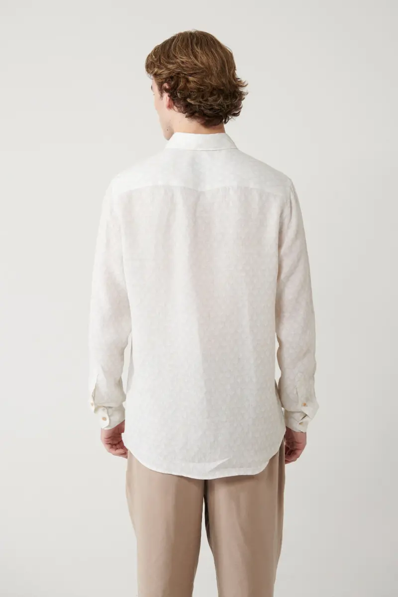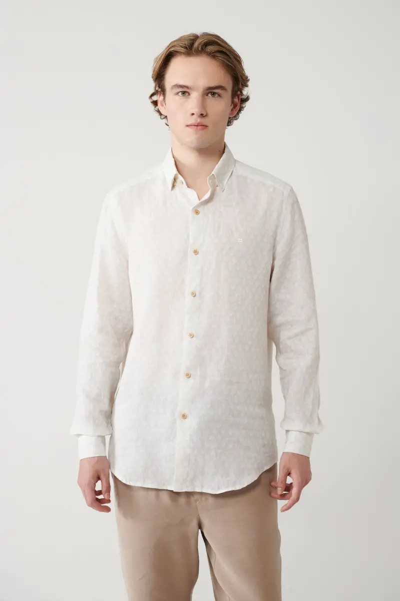 Наша мужская бежевая рубашка, сочетающая в себе стиль и комфорт, станет незаменимой частью вашего гардероба. Эта рубашка, придающая вашему стилю изысканность благодаря британскому воротнику и рисунку в виде листьев, изготовлена из 100% льняной ткани. Естественная воздухопроницаемость и легкость льна подарят вам комфорт на весь день.