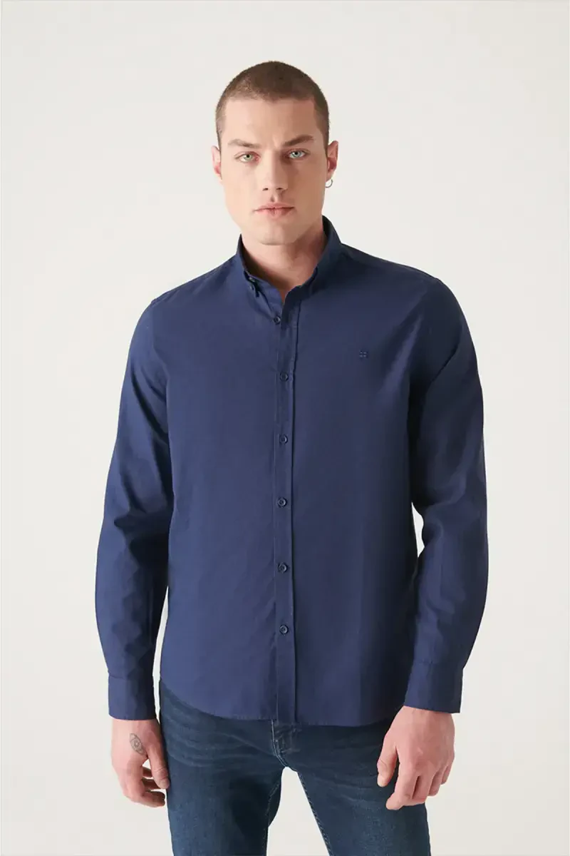 Наша мужская синяя рубашка сочетает в себе вневременную элегантность и комфорт, добавляя изысканный штрих к вашему повседневному стилю. Изготовленная из 100% хлопчатобумажной ткани, эта рубашка обеспечивает комфорт в течение всего дня благодаря своей мягкой текстуре. Ее воротник на пуговицах и крой regular fit создают классический образ, а синий цвет подходит к любому стилю.