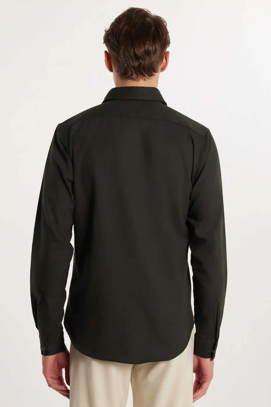 Эта мужская рубашка из денима с узким силуэтом, сочетающая в себе стиль и комфорт, станет незаменимым элементом вашего гардероба. Узкий крой и длинные рукава придают ей современный вид, а деним с эффектом стирки и спортивный воротник обеспечивают комфорт и свободу движений. Двойные карманы добавляют стиль и практичность. Хаки - классический цвет, который подходит к любому стилю.