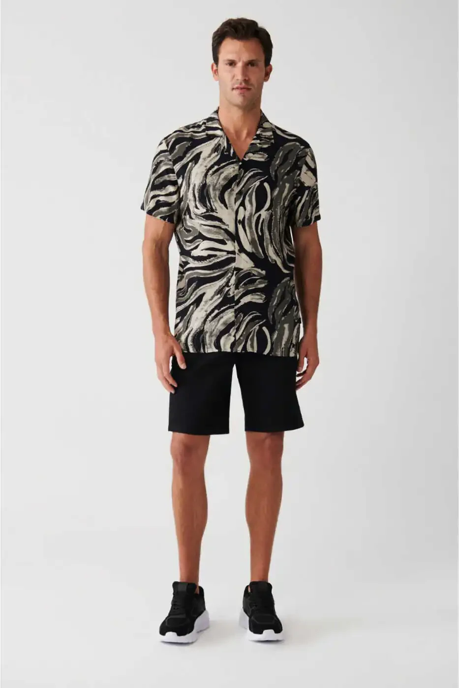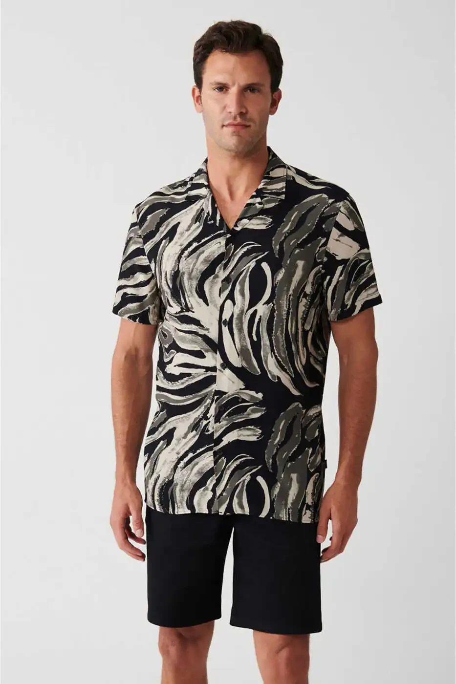 мужская рубашка, черная рубашка, вискозная рубашка, рубашка с кубинским воротником, рубашка с леопардовым принтом, рубашка с коротким рукавом, рубашка regular fit