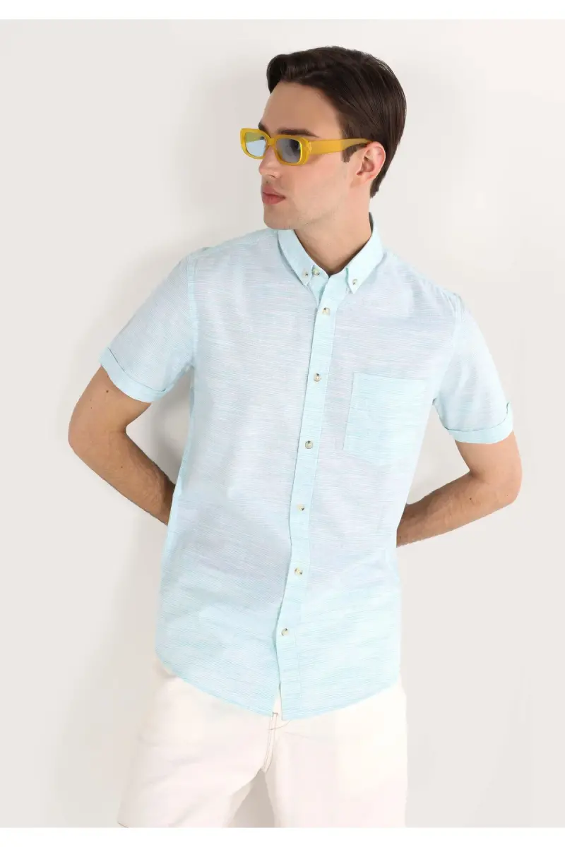 Сочетая стиль и комфорт, Мужская рубашка с коротким рукавом Slim Fit Basic зеленого цвета станет незаменимой частью повседневной жизни. Эта рубашка, разработанная для комфорта в течение всего дня благодаря своей мягкой фактуре и дышащей ткани, предназначена для любого стиля. Ее классический зеленый цвет добавит изысканности вашему образу, а она прекрасно сочетается с джинсами, чиносами и брюками.
