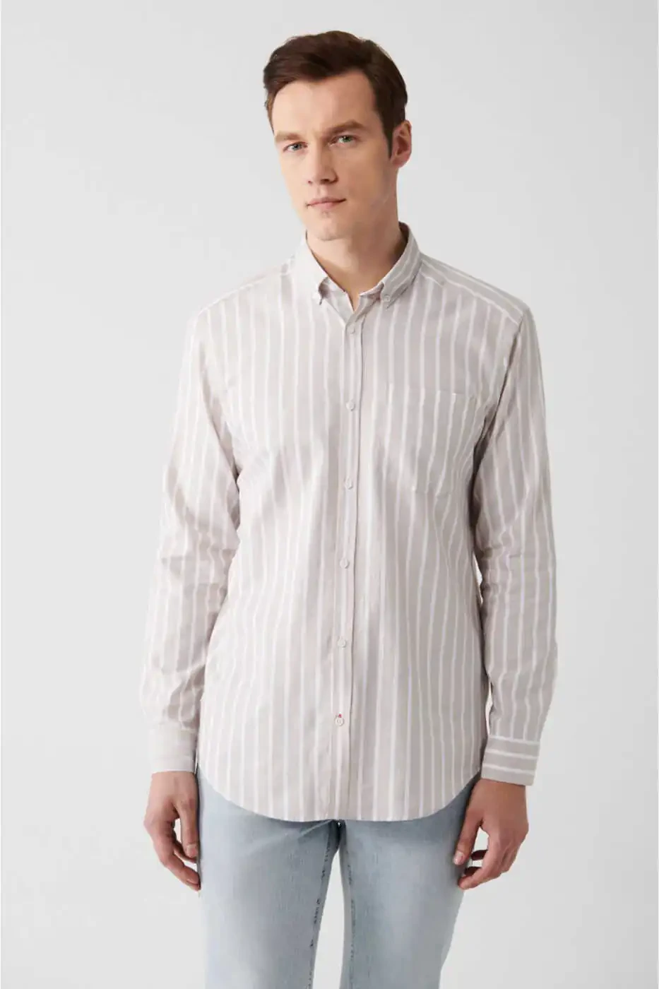 Эта классическая мужская рубашка, сочетающая в себе стиль и комфорт, станет незаменимой частью вашего гардероба. Рубашка из 100% хлопковой ткани Оксфорд обеспечивает комфорт в течение всего дня благодаря своей мягкой фактуре и воздухопроницаемой структуре. Бежевый цвет и тонкие полоски делают ее подходящей для любого сочетания. Покрой Regular Fit удобно садится по фигуре, а рубашечный воротник с пуговицами придает стильный вид.