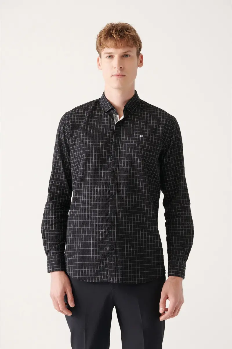 мужская рубашка, черная рубашка, рубашка в полоску, хлопковая рубашка, рубашка в клетку, рубашка slim fit, приталенная рубашка, A31y2214